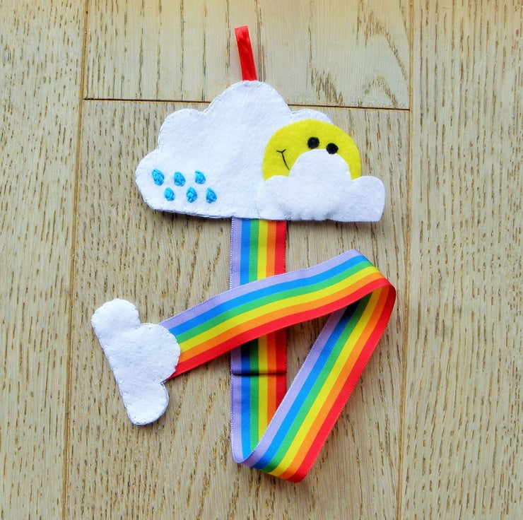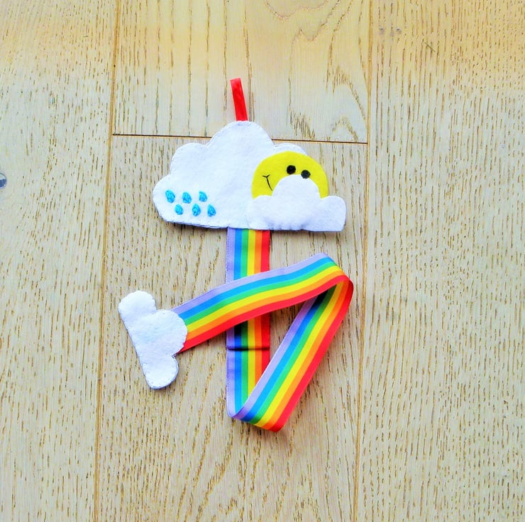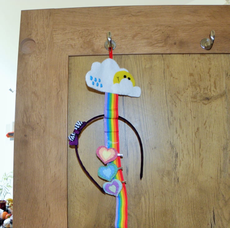 This gorgeous rainbow clip holder featuring a cheerful sun, is a fabulous way to store your hair accessories. She is made from felt and ribbon, and has a loop at the top so she can be hung up or pinned to the wall.