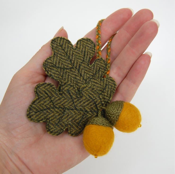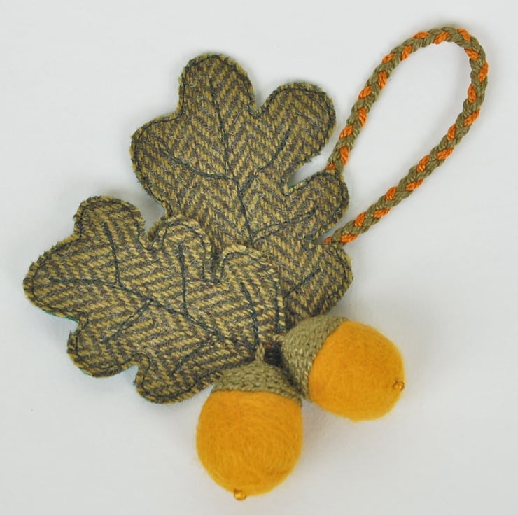 Acorn is made from a hand felted wool, with a glass bead and embroidered cup. Leaves are stitched in free-motion machine embroidery, on green tweed with a felt backing.