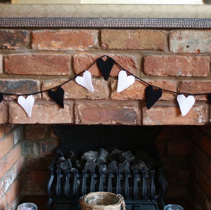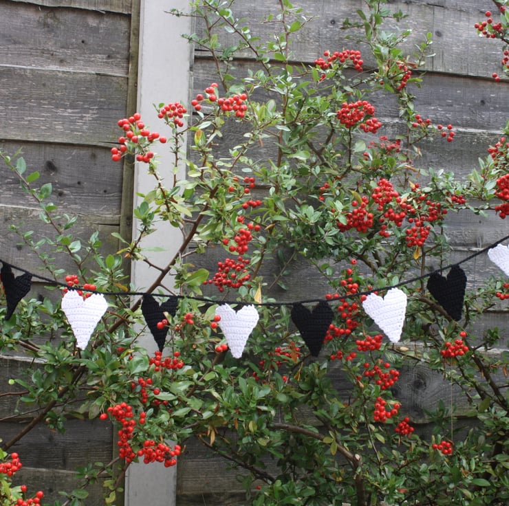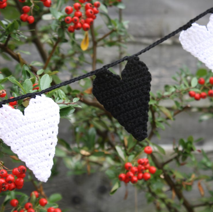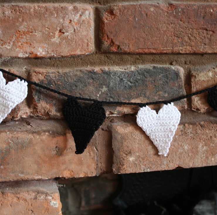 Decorate your home with this modern hand crocheted heart garland. I have used good quality black and white cotton. There are 11 hearts each measuring approx 8cm x 6cm. The length of the whole garland is approx 125cm and has loops at each end for easy hanging.