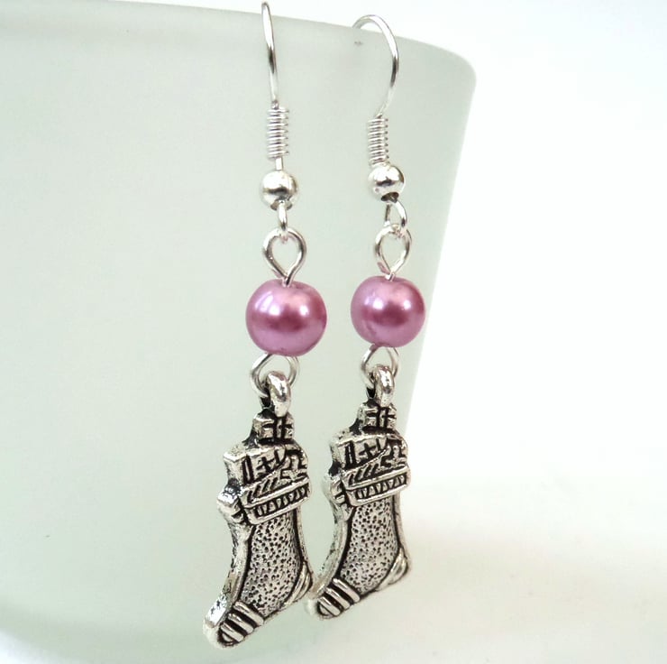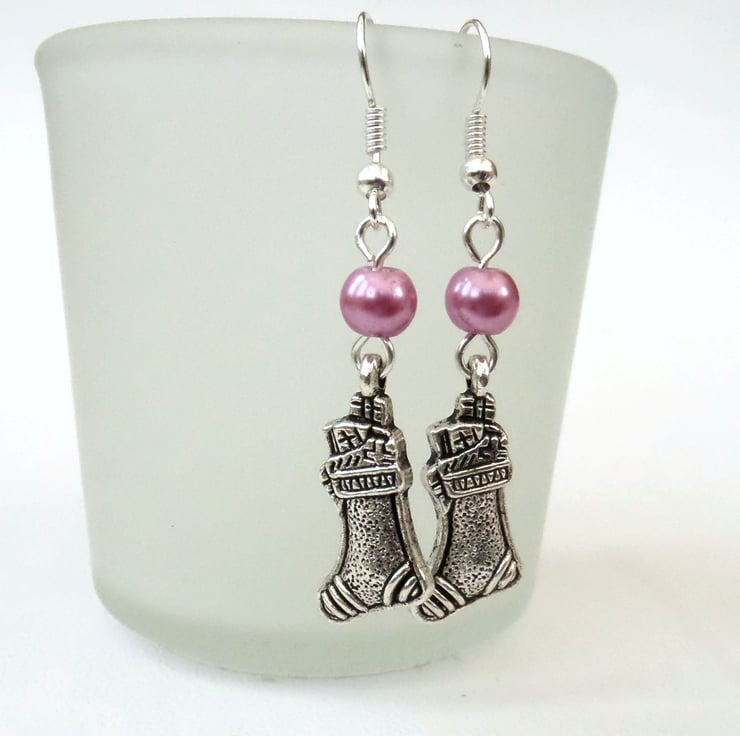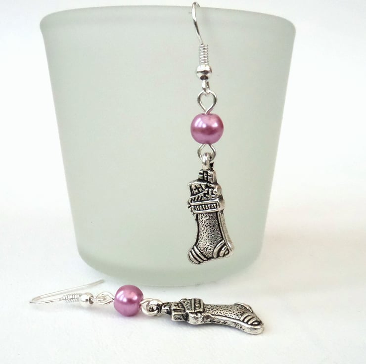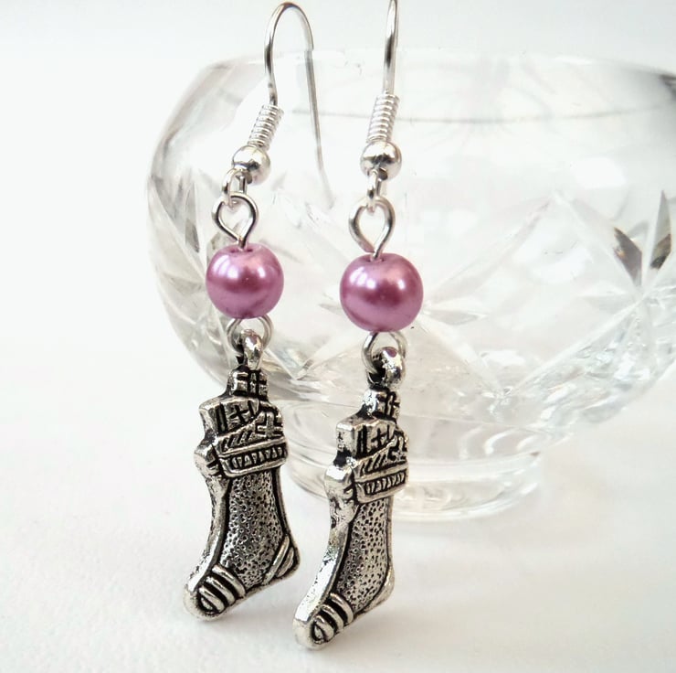 A pretty tibetan silver Christmas stocking charm hangs with a lilac 6 mm glass pearl on silver plated wires.