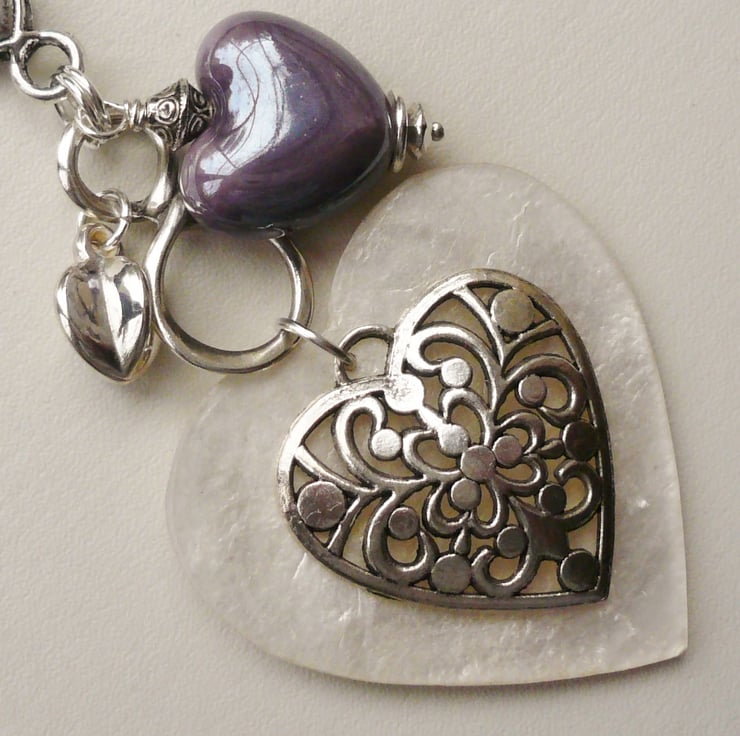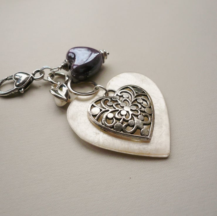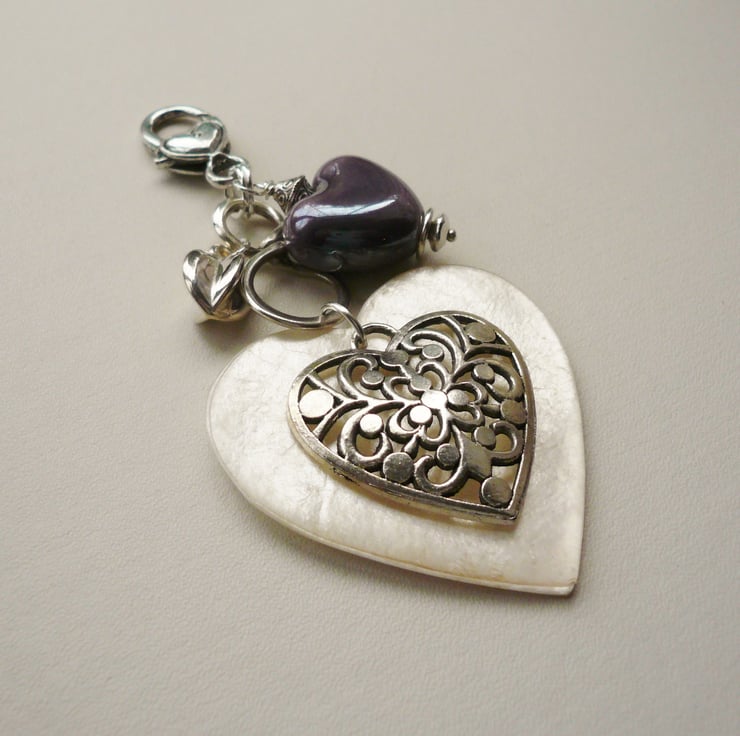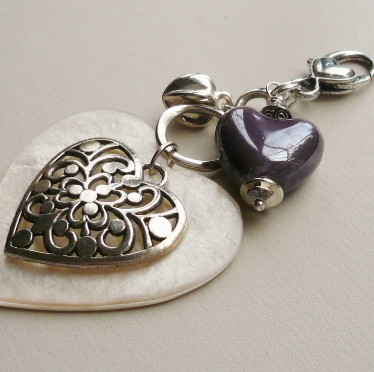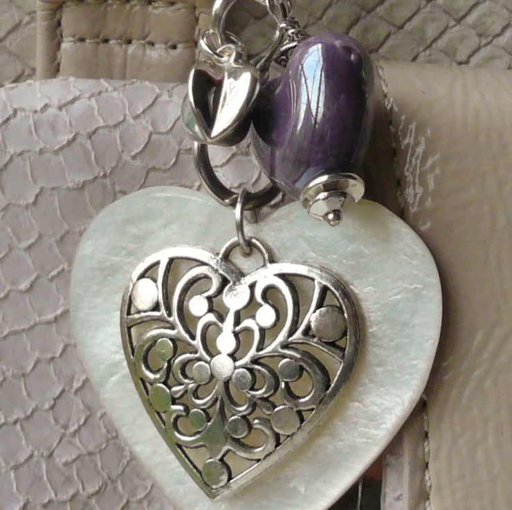 This pretty handbag charm is made up of a 5cm flat capiz shell heart with a 30mm Tibetan silver ornate heart pendant attached, teamed with a 20mm purple ceramic heart bead and a 10mm metalised acrylic winged heart charm. All attached by a 28mm long Tibetan silver twisted ring connector to a 25mm heart trigger clasp.