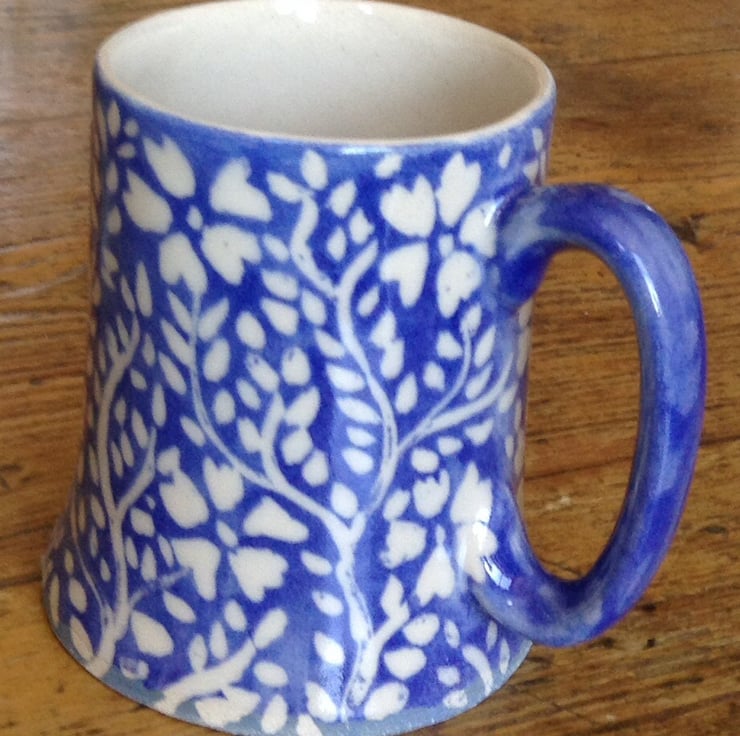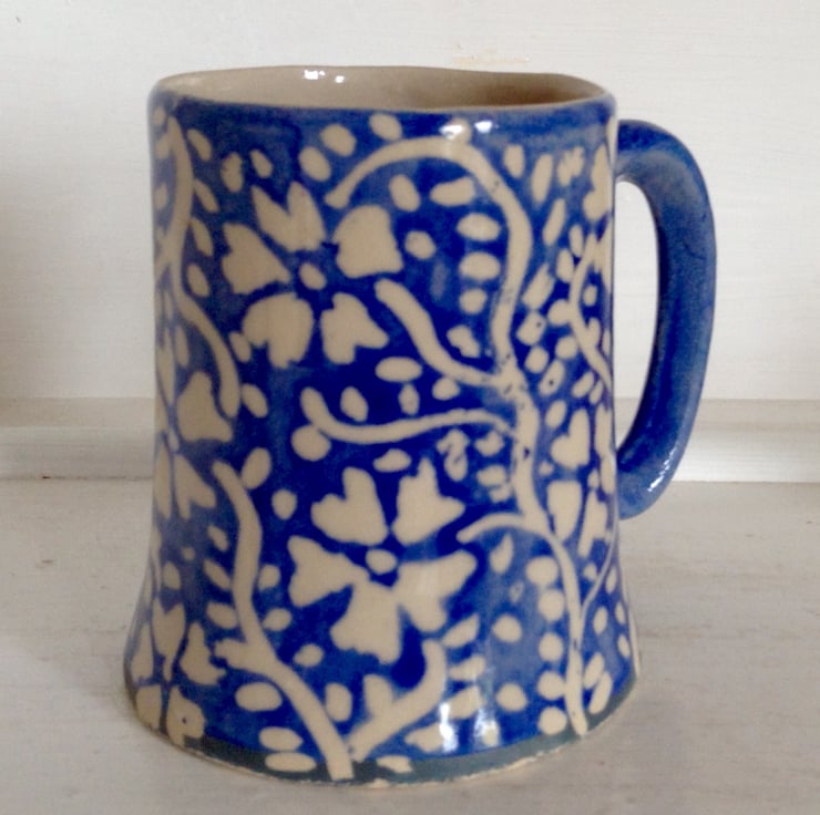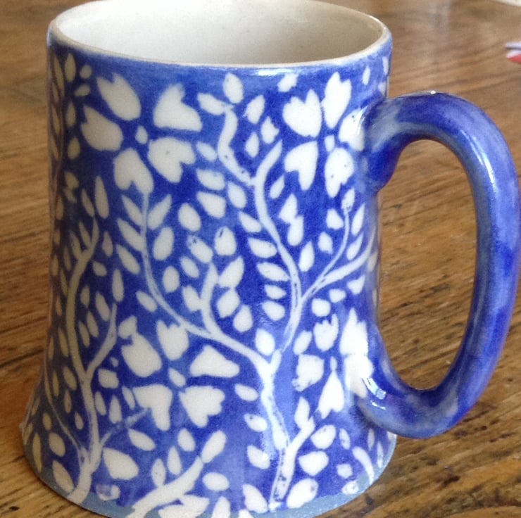 Blue and white stoneware mug. Handmade and hand decorated. Dishwasher and microwave safe.