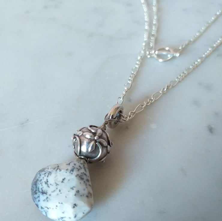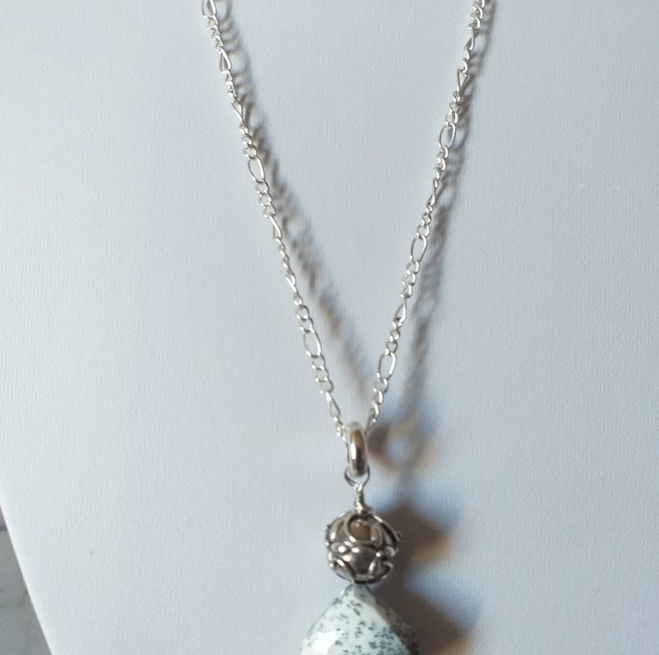 A beautiful hand faceted Dendrite Opal hangs from a Silver Plated Figaro chain ( chain is lovely)