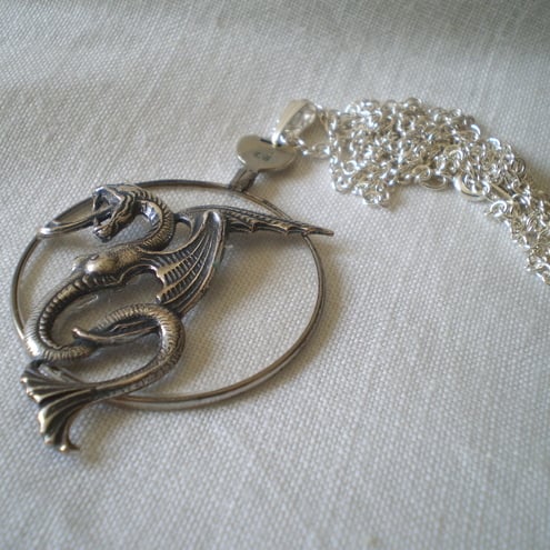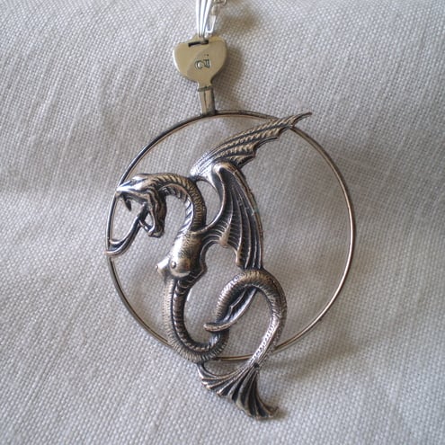 A mythical Sea Dragon waits .... A Vintage glass optical lens has become her resting place. Sheer fantasy in a necklace. Hangs from a 18 inch silver plated chain and is 3 cms in dia.