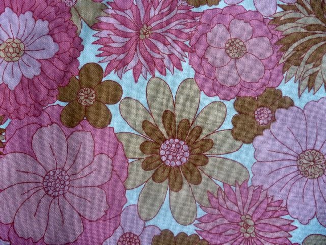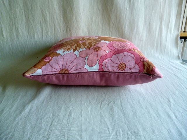 This cushion cover is made from a piece of unused vintage cotton/linen fabric which was designed for M&S in the 1970s. The fabric, which is in excellent unused condition, features a large floral pattern of stylised flowers in shades of pink and beige on a white background. The back of the cushion cover is made from plain pink cotton and the cover fastens with a zip at the bottom. The cover is made to a high standard and all internal seams are overlocked for strength.