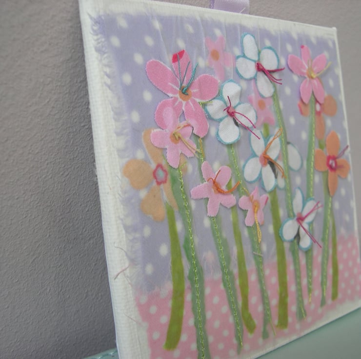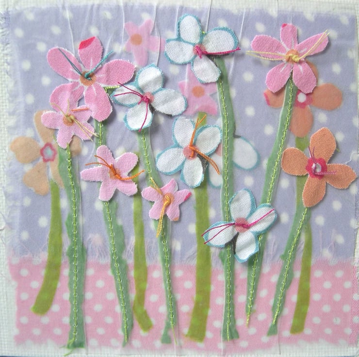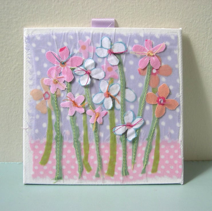 'Flower Garden' textile artwork in pastel pinks and lilac, a perfect gift for mothers day
