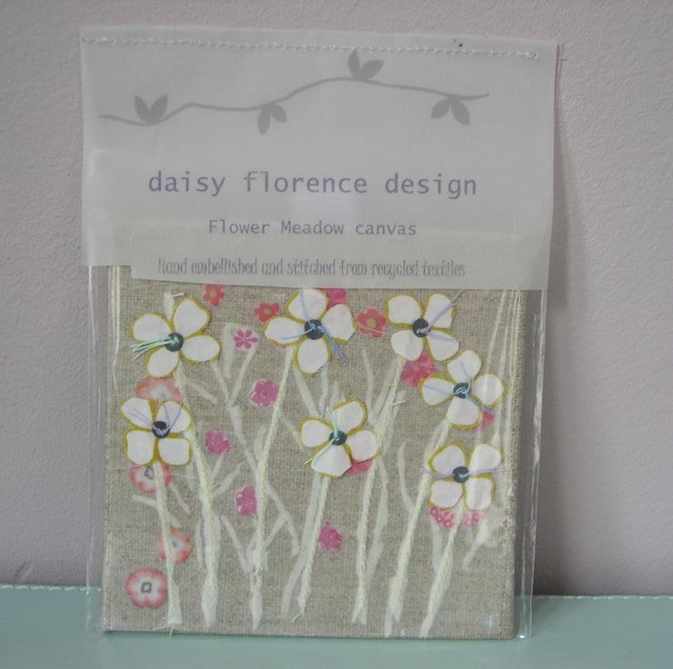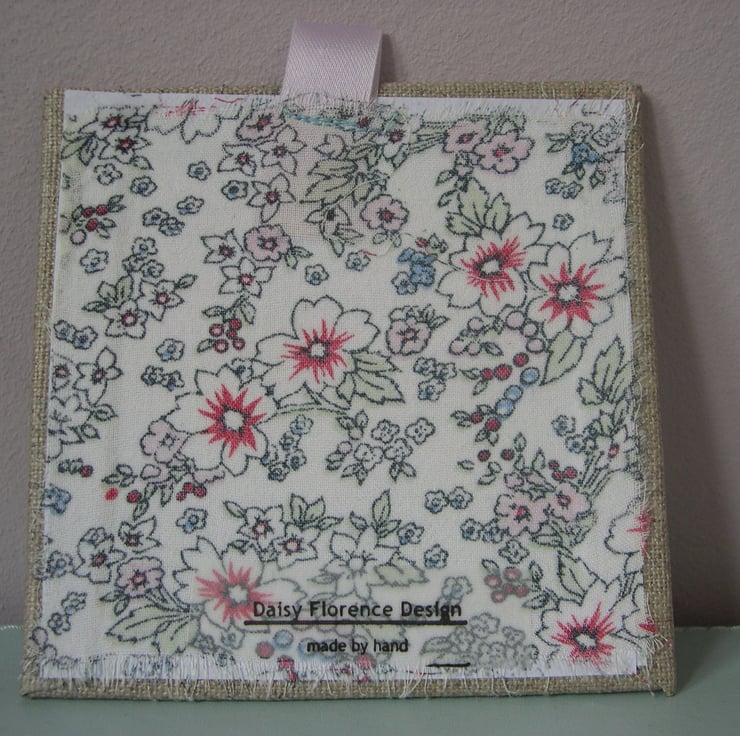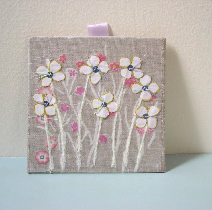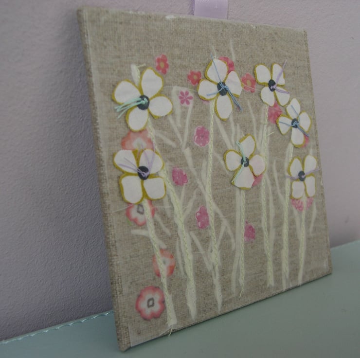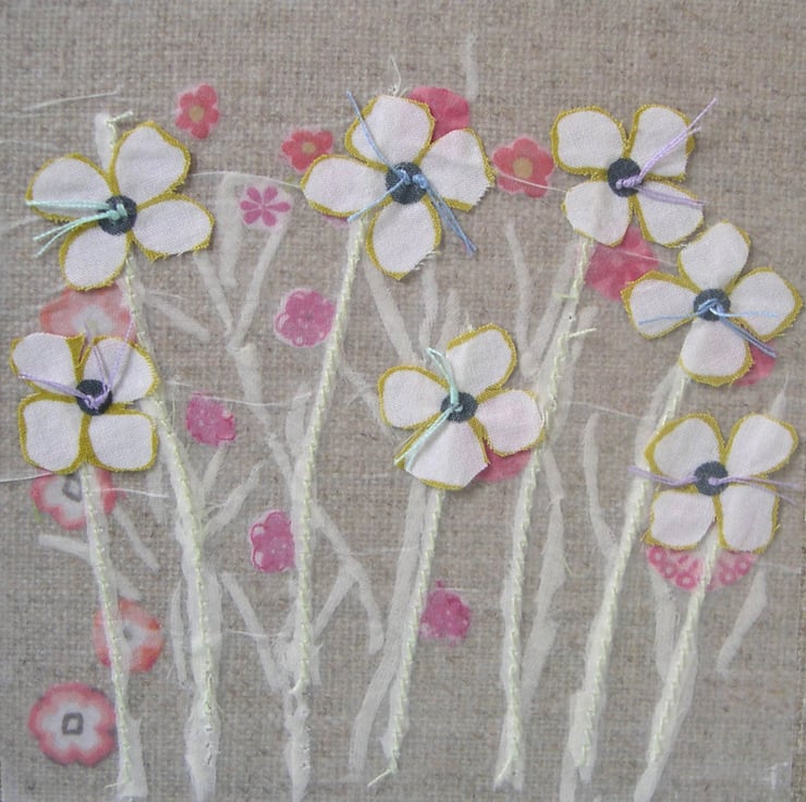 The garden has been lovingly created from recycled cotton fabrics - each of those pretty flowers has been cut out by hand! I use a combination of machine stitching and hand sewing to build up the layers before the piece is finally attached to an artists board. The reverse of the piece is also covered with a patterned fabric.