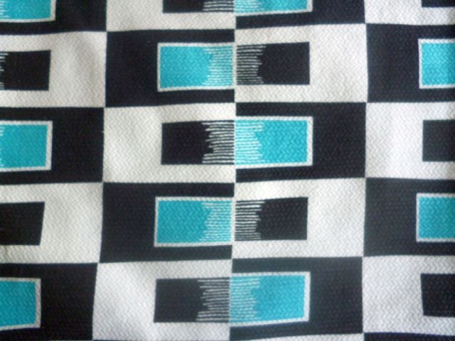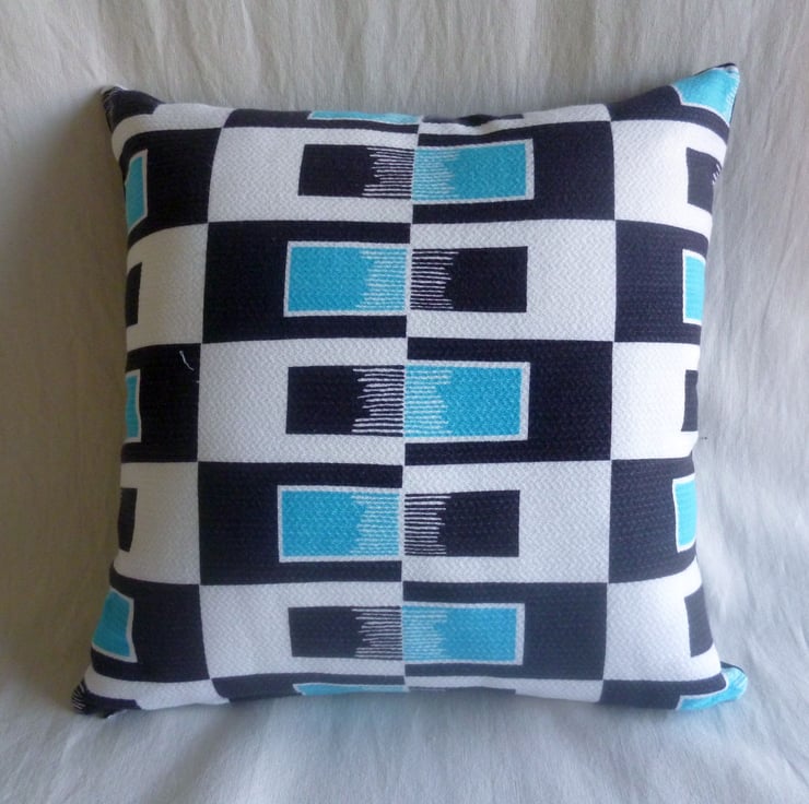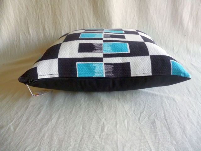 This cushion cover is made from a piece of unused vintage cotton barkcloth and features a bold op art design of rectangles in black and turquoise on a white background and dates from the 1960s. The back of the cushion cover is made from plain black cotton twill and the cover fastens with a zip at the bottom. The cover is made to a high standard and all internal seams are overlocked for strength.