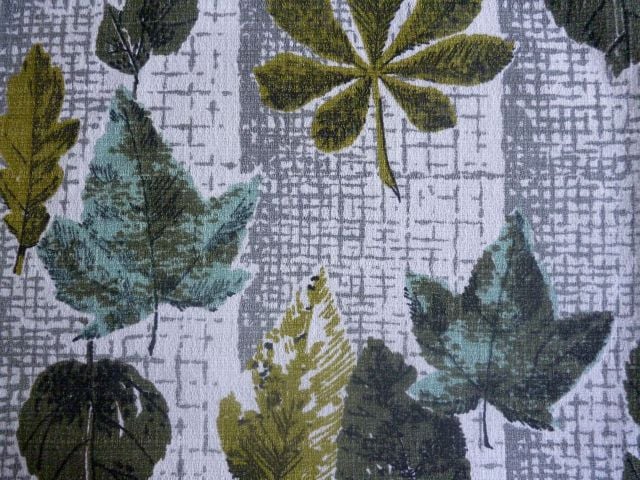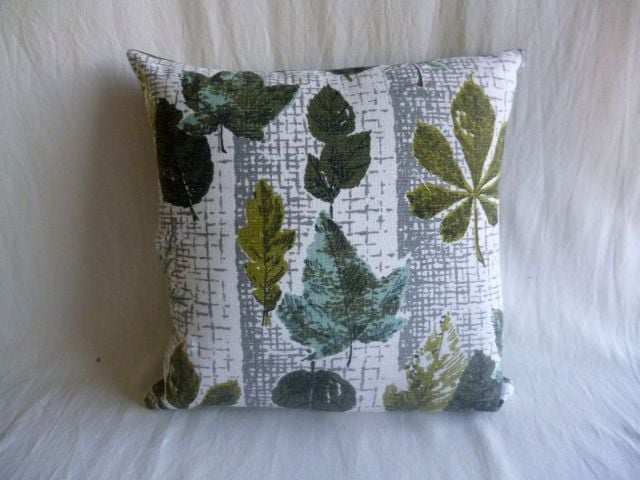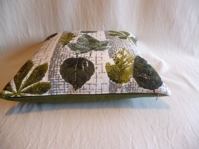 This cushion cover is made from a piece of vintage cotton fabric which has been reclaimed from a curtain. The fabric, which is in very good reclaimed condition, features a design of different types of leaves in various shades of green on an ivory and grey checked background and dates from the 1960s. The back of the cushion cover is made from plain green cotton twill and the cover fastens with a zip at the bottom. The cover is made to a high standard and all internal seams are overlocked for strength.