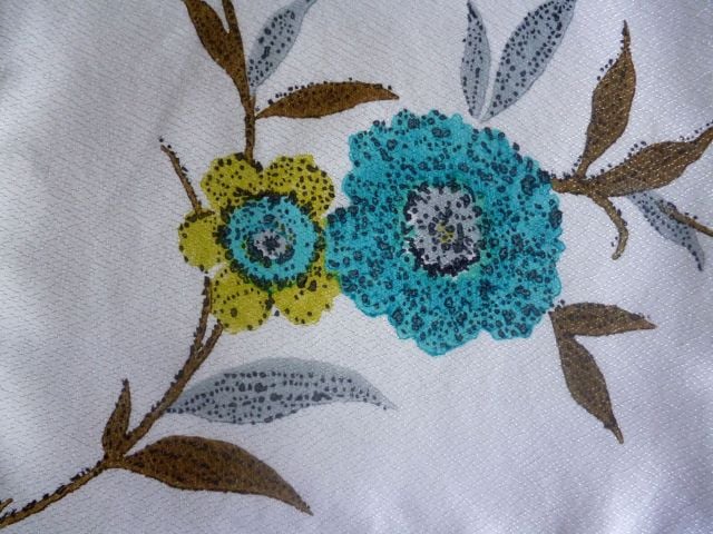 This cushion cover is made from a piece of vintage silky fiberglass fabric ( a popular choice for fabrics years ago) which has been reclaimed from a curtain. The fabric, which is in very good reclaimed condition, features a large floral design in turquoise, mauve and ochre on a textured ivory coloured background and dates from the 1960s. The back of the cushion cover is made from plain white cotton twill and the cover fastens with a zip at the bottom. The cover is made to a high standard and all internal seams are overlocked for strength.