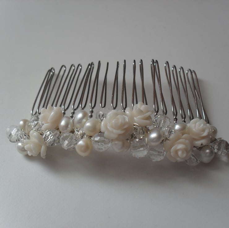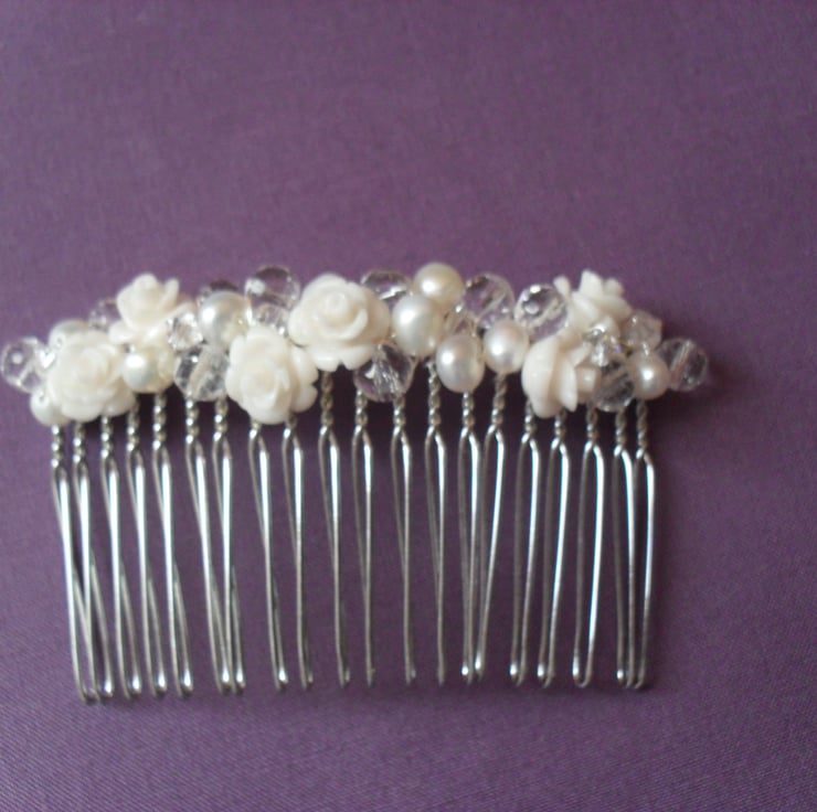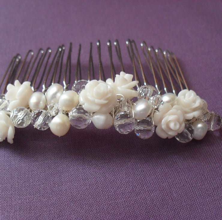 SALE was £12.95 now £6.50 White freshwater pearls and ivory reformed coral flowers with crystals are attached to a silver tone hair comb