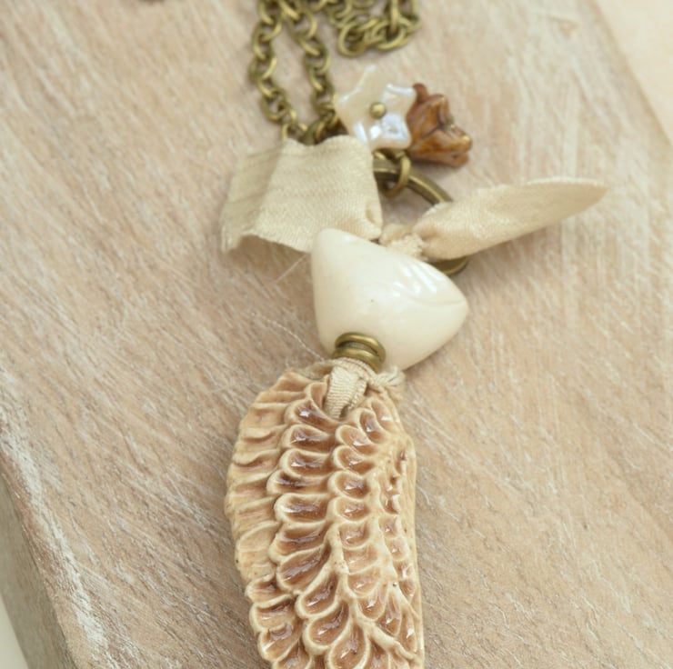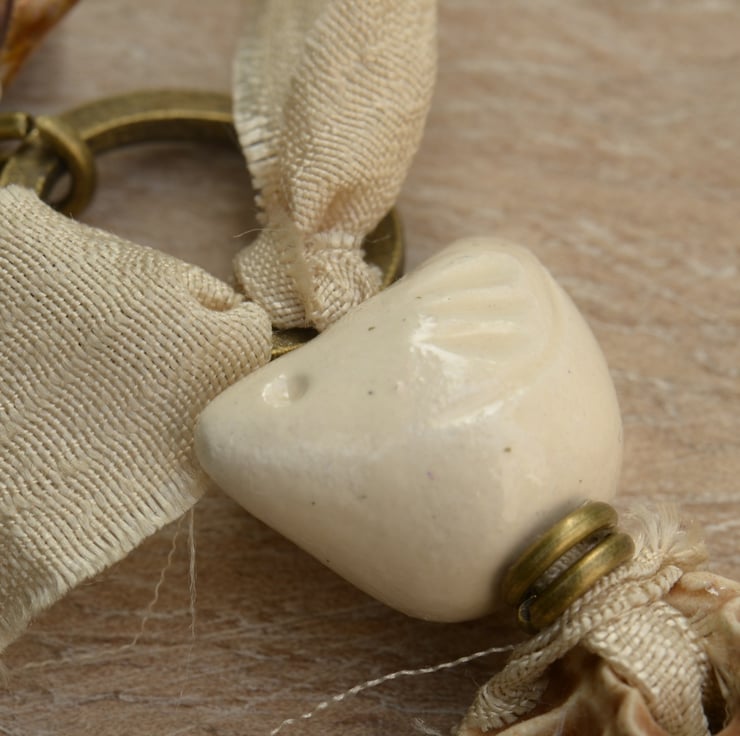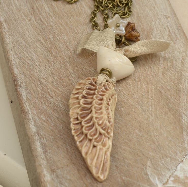 A lovely handmade wing pendant is the focal in this necklace which I have teamed with a little knot of cream sari silk ribbon nesting on top a ceramic cream handmade bird with an antique bronze plated circular connector with a little bouquet of Czech glass cream and Picasso finish beige glass flower beads with a chain of antique bronze plated chain.
