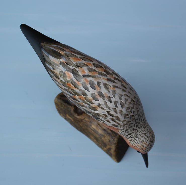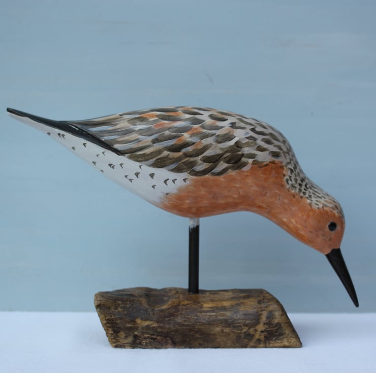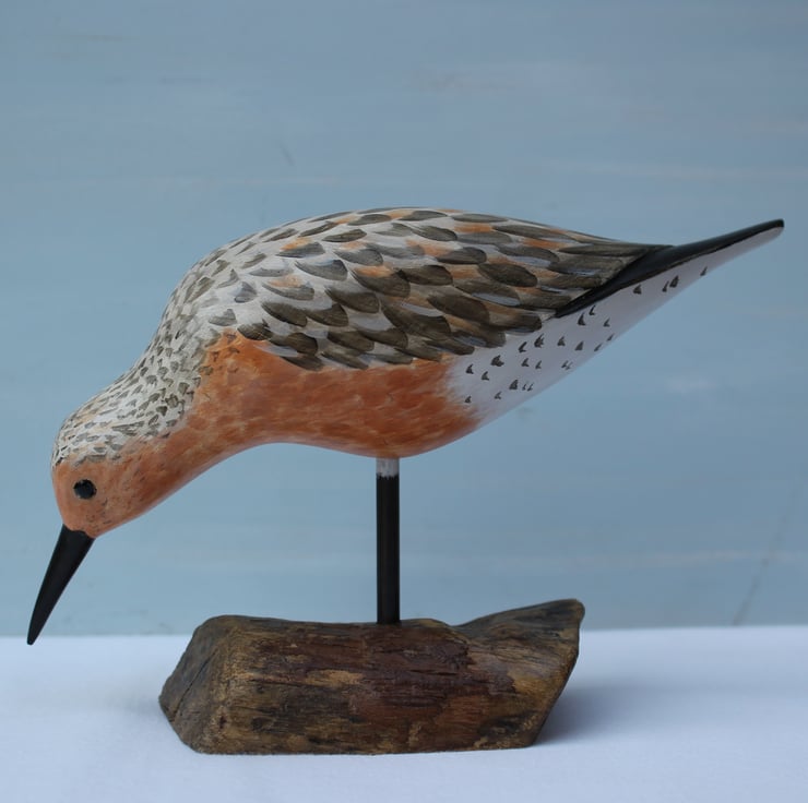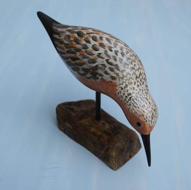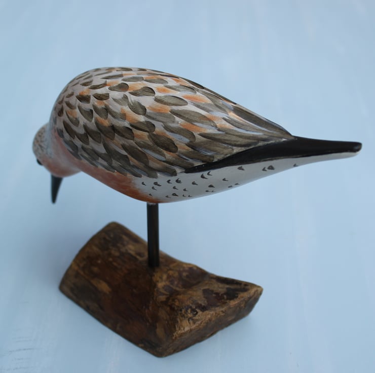 Hand carved from jelutong and painted with acrylics, this small wading bird has lovely rusty coloured plumage. It has hand coloured glass eyes and is finished to a soft shine with wax.