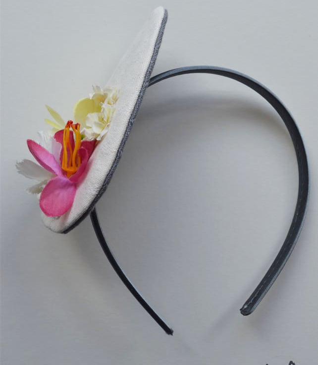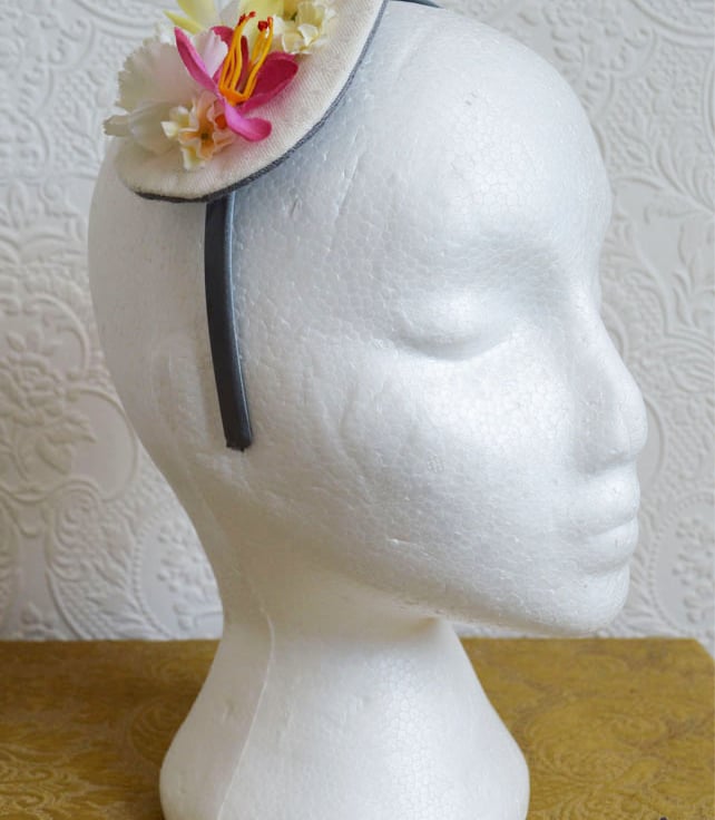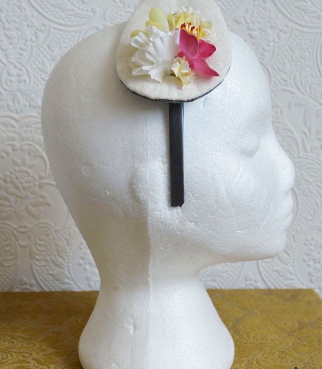 Handmade fascinator with vintage fake flowers and reclaimed vintage fabric base. This piece is one a kind, perfect for weddings and parties.