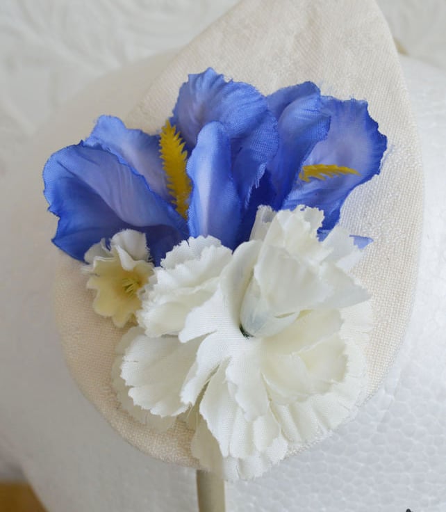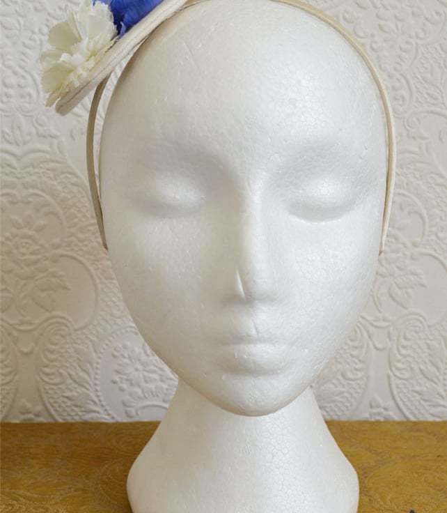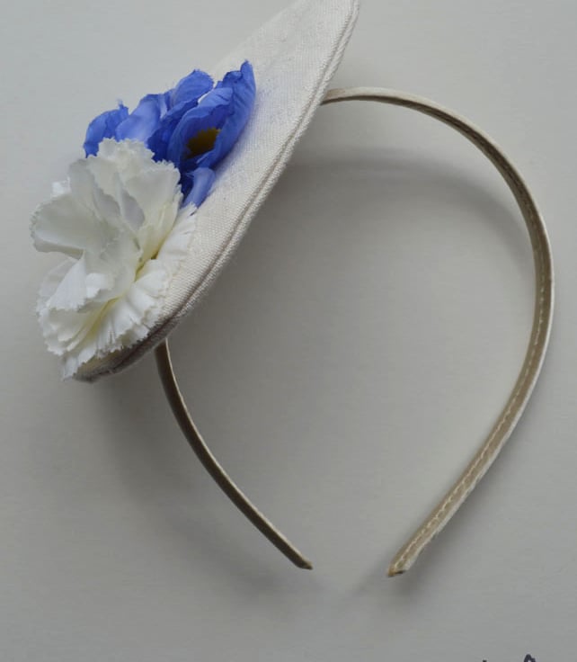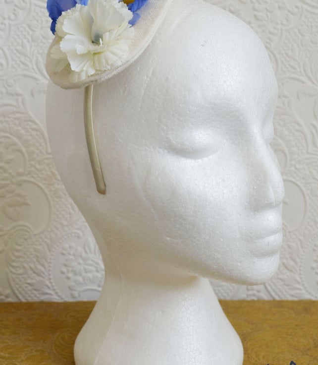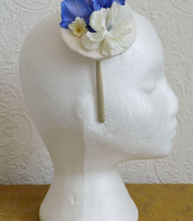Handmade fascinator with vintage fake flowers and reclaimed vintage fabric base. This piece is one a kind, perfect for weddings and parties.