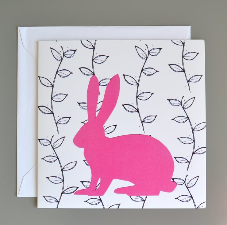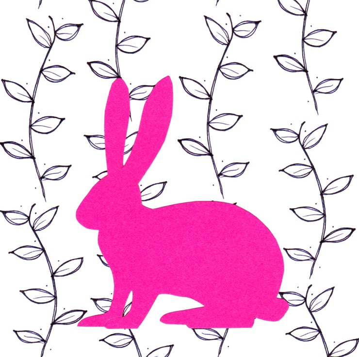 Bright pink silhouette of a sitting hare in front of a black and white background made from a hand-drawn leaf design.