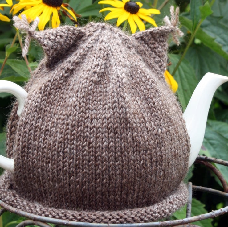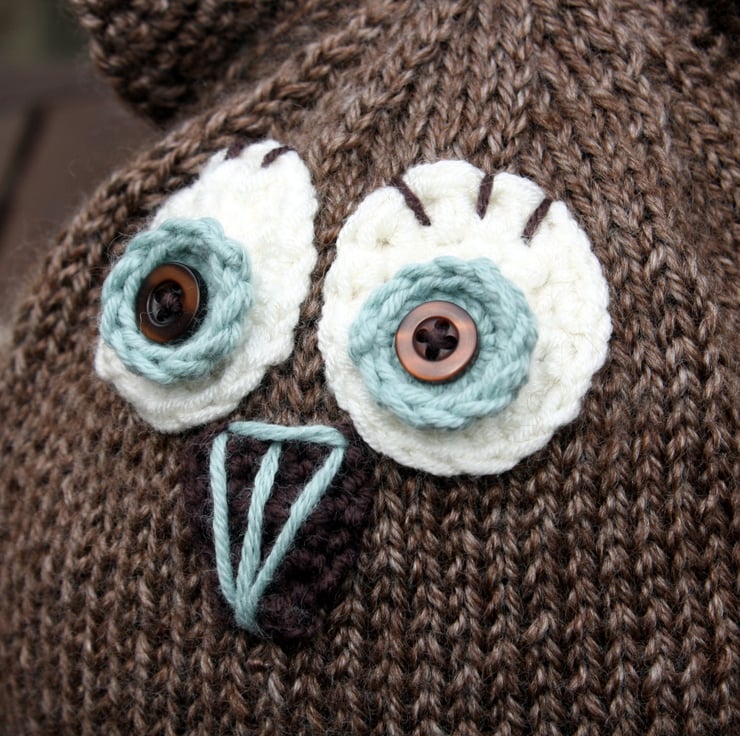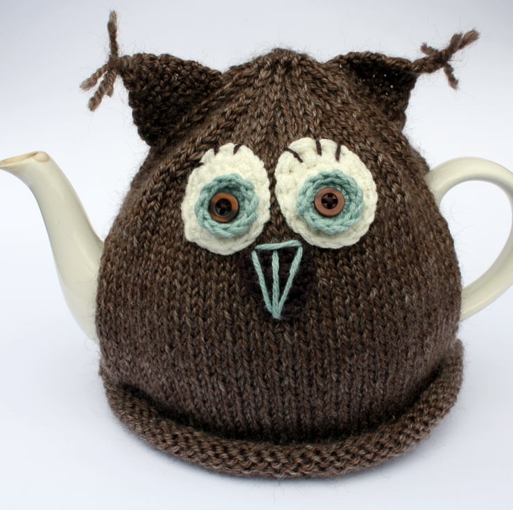 Hand knitted brown owl tea cosy with crocheted eyes and ears. Made with a lovely soft wool mix aran yarn. Will fit a standard 4 - 6 cup teapot.