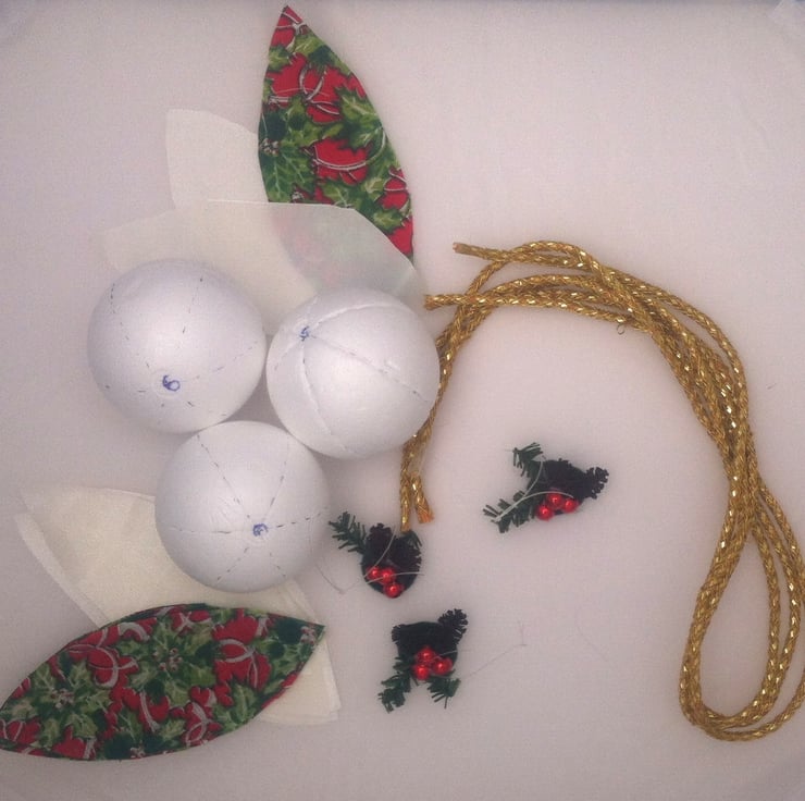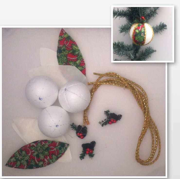 6cm polystyrene balls have been marked and scored ready to accept the pre cut pieces of fabric and trim. These baubles are simple to make and require only an implement such as a cocktail stick or fine knitting needle and either pins or glue. Even the finishing touch of an artificial pine sprig and bead berries is supplied along with nylon hanging thread. Everything else that is required is included in the kit including full illustrated instructions.