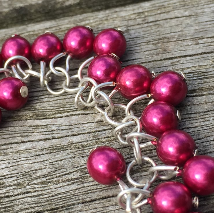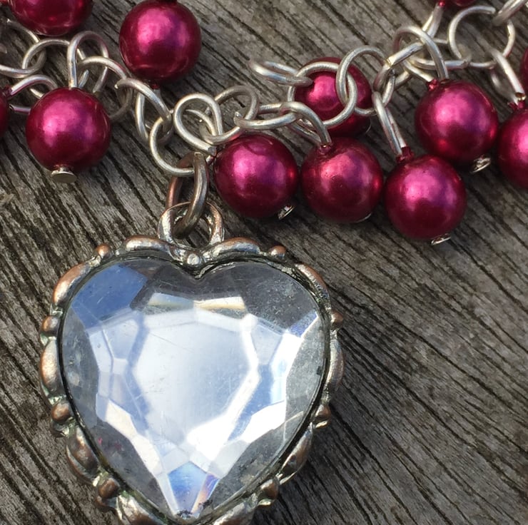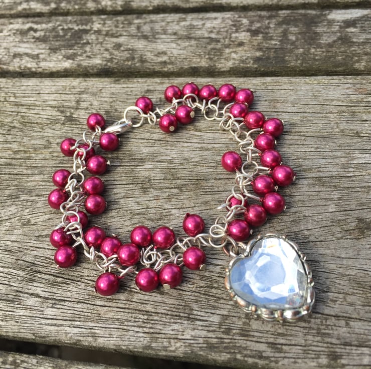 Silver plated bracelet with burgundy red glass pearls and metal framed plastic heart pendant
