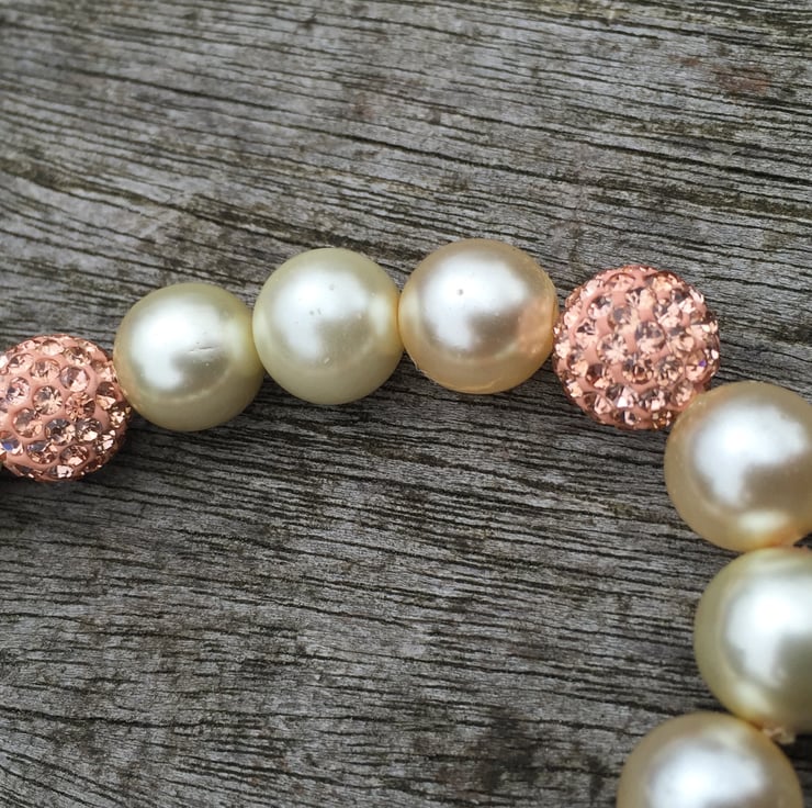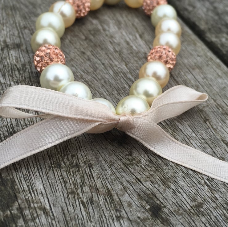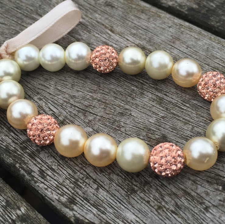 Glass pearls and champagne coloured shamballa beads on elasticated bracelet with ribbon bow.