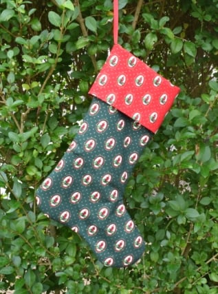 This lovely Santa's Christmas Stocking is Handmade from 2 different coloured Festive fabrics in Reds Greens and Golds, and lined with a Red Cotton Fabric. It has a small piece of Grosgrain ribbon at the top so its perfect for hanging up on a childs bedroom door ready for Santa to visit the little ones.