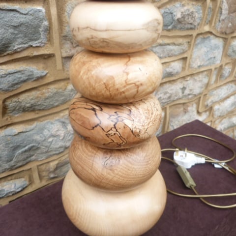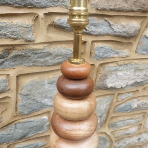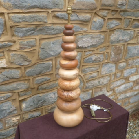 MADE FROM ELEVEN DIFFERENT ENGLISH HARDWOODS, THESE ARE :- CHERRY, WALNUT HEARTWOOD, HOLM OAK, ELM, WALNUT SAPWOOD, YEW, SPALTED MAPLE, BOX ELDER, SPALTED BEECH, BROWN OAK WITH ASH AT THE BOTTOM, THIS PIECE IS 8'' IN DIAMETER , THE LAMP IS 30'' IN TOTAL HEIGHT, THE FINISH IS DANISH OIL AND WOODWAX, A SOLID AND HEAVY PIECE HENCE THE HIGH CARRIAGE COST.