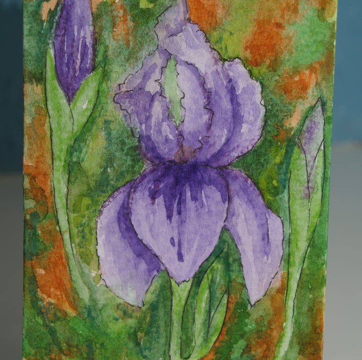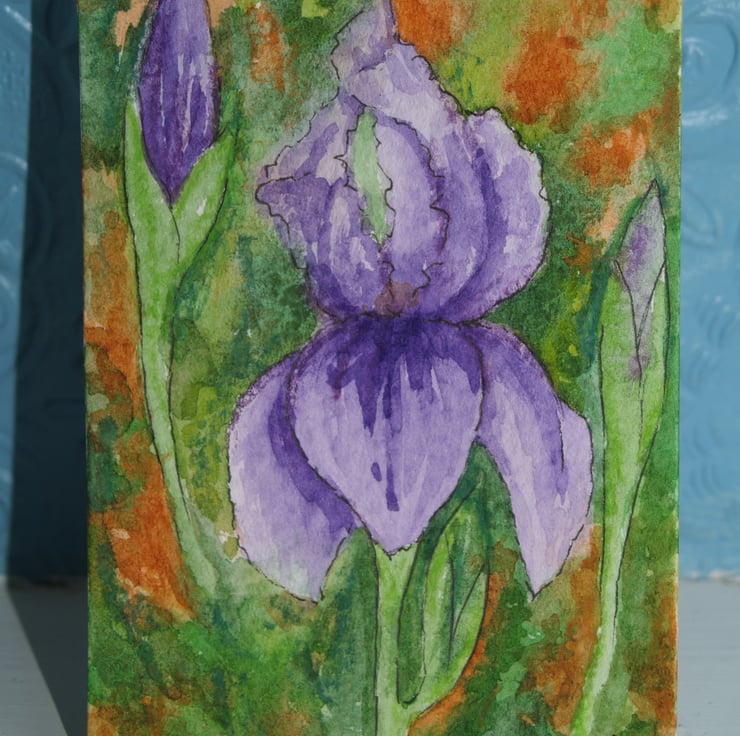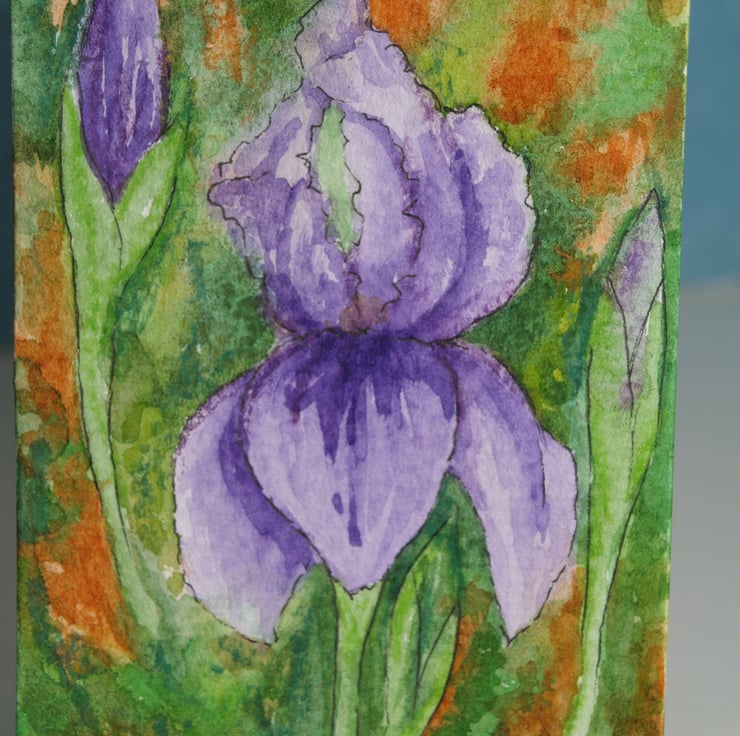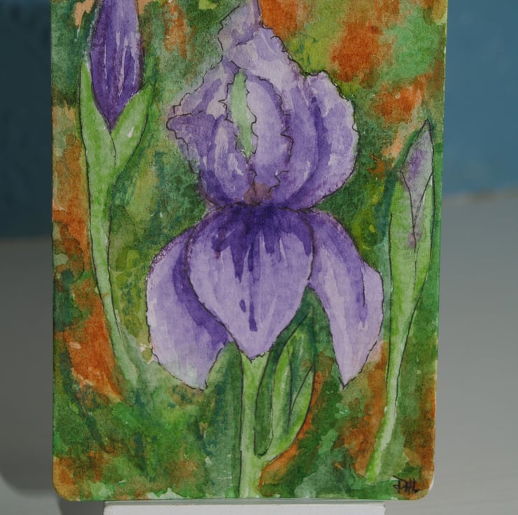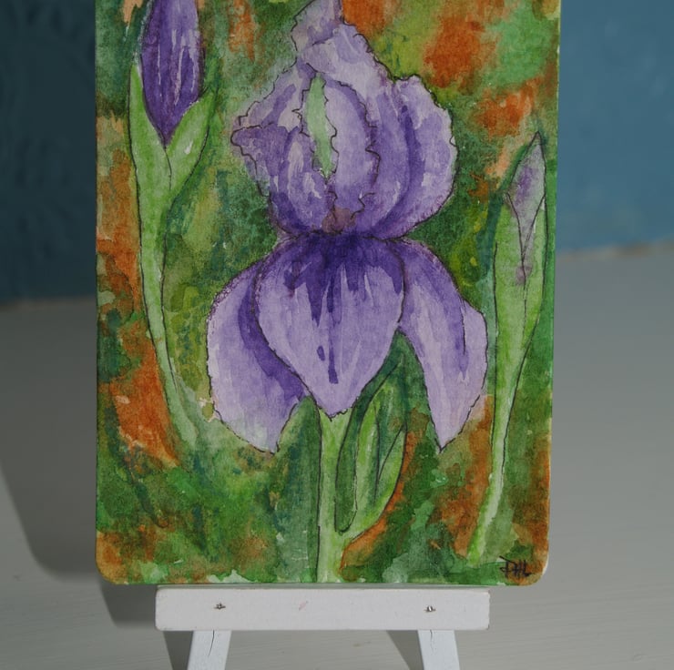 This ACEO is an original, mixed media painting of an Iris flower. It measures 2.5 x 3.5 inches (63 x 89mm).