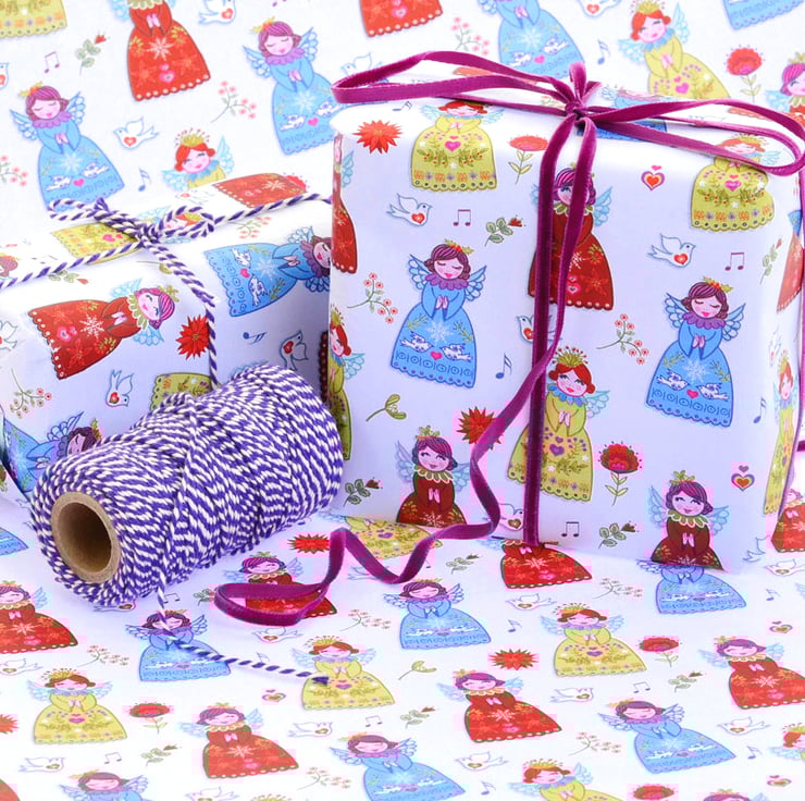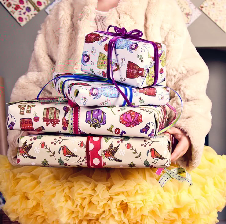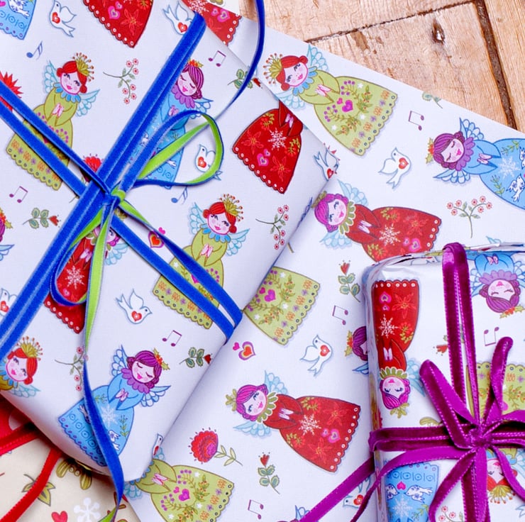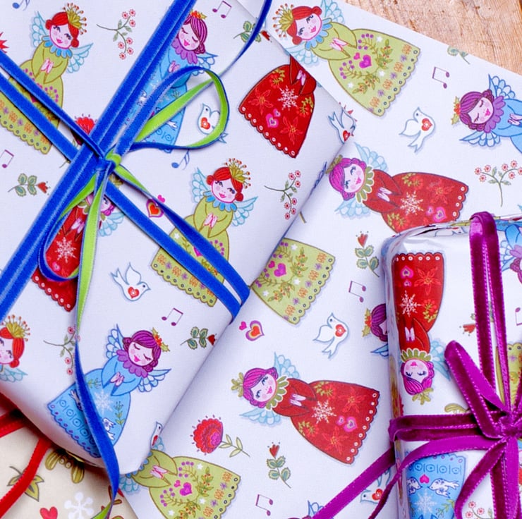 Gift wrap comes as folded flat sheets inside a protective cello sleeve.