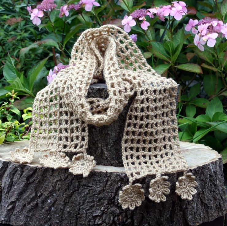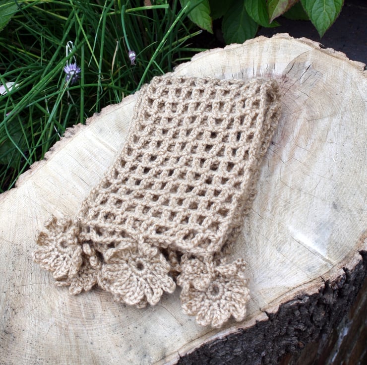 A crocheted mesh scarf with crocheted flowers attached. Made with acrylic aran yarn. Measures approx 150cm x 14cm. Perfect for cool autumn days and spring sunshine.