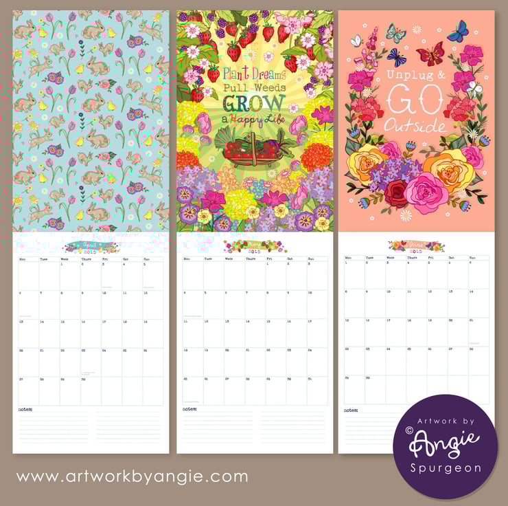 This is an A4 (297mmx 210mm) sized booklet style wall calendar. When hung, the top A4 page features a colourful illustration or pattern selected from my current greetings and gift wrap collections - perfect for framing as prints once the calendar is finished. The bottom A4 page features the calendar which has plenty of space by each date to write appointments and reminders in. Throughout the calendar are a few key dates and bank holidays, very discretely typed at the bottom of the appropriate date.