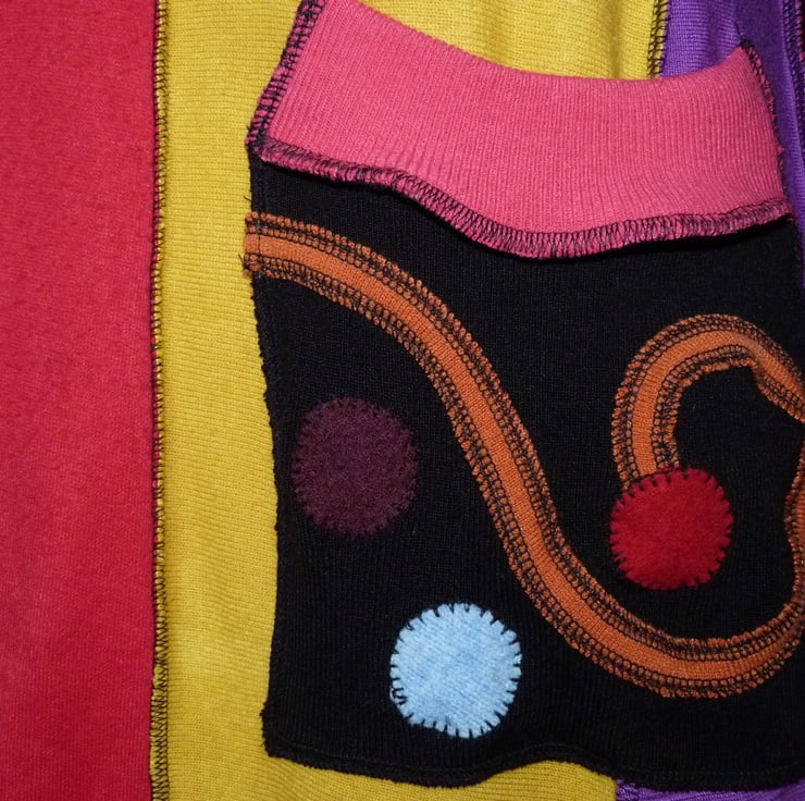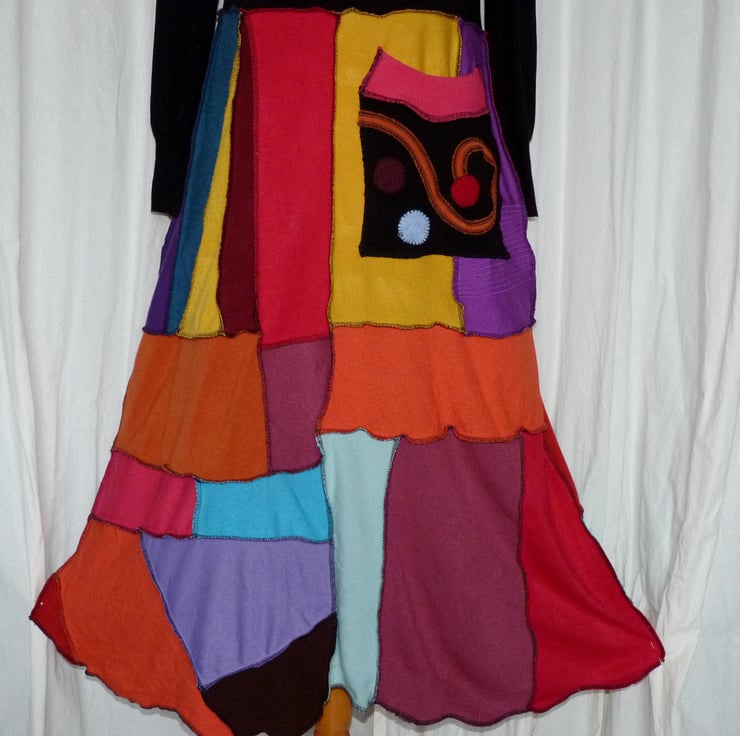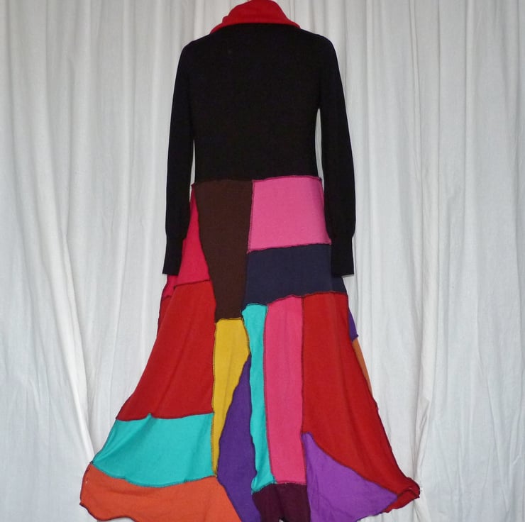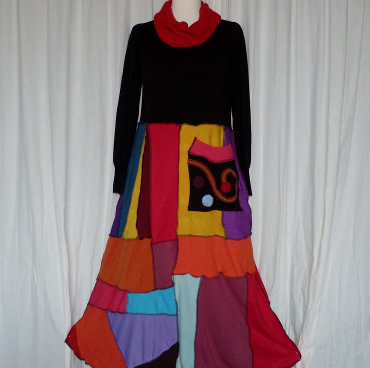 The jumpers have been carefully selected in a full rainbow of colours. There is a large cowl neck in a contrasting colour, a large decorated patch pocket stitched onto a random patchwork A-line skirt. The hem has a sculptured finish.