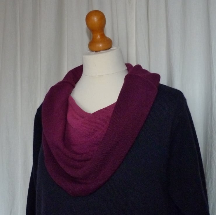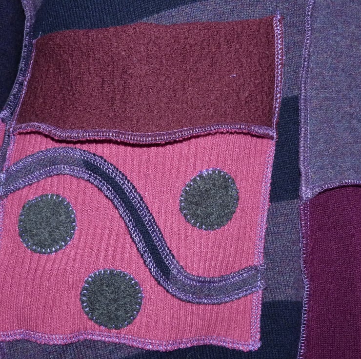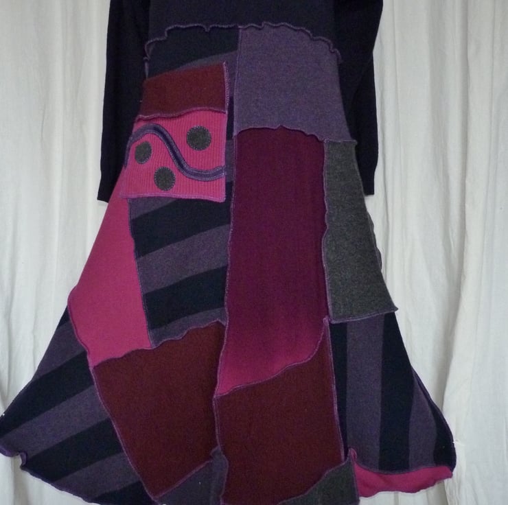 The jumpers have been carefully selected in blues and purples. They are mainly merino and lambswool, so this is a very warm and cosy winter dress. There is a large cowl neck in a contrasting colour, a large decorated patch pocket stitched onto a random patchwork A-line skirt. The hem has a sculptured finish.