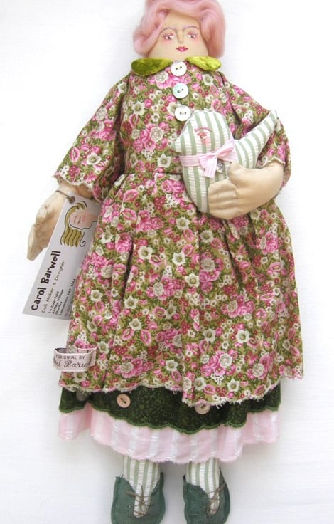 The fat quarter was a gift and I started with that, I chose coordinating fabrics from my recycled stash and toned in her hair. Like many of my girls she evolved as I was making her. Their faces are all unique, I use the same pattern but they all come out different. She has a warm face and the candy pink hair compliments that.