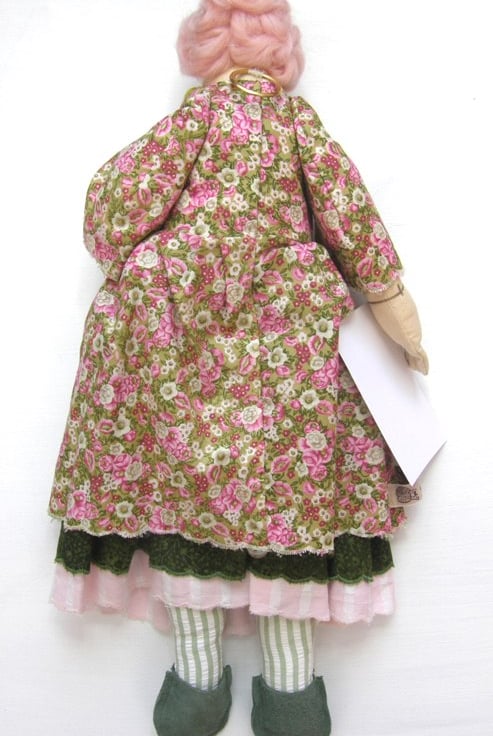 Tilly is an original handmade cloth doll, she has a hand dyed calico body and has a hand painted face, she carries a little bird and has tiny leather shoes. Her hair is hand stitched and hand styled wool tops and is candy pink. She is made to my own pattern.
