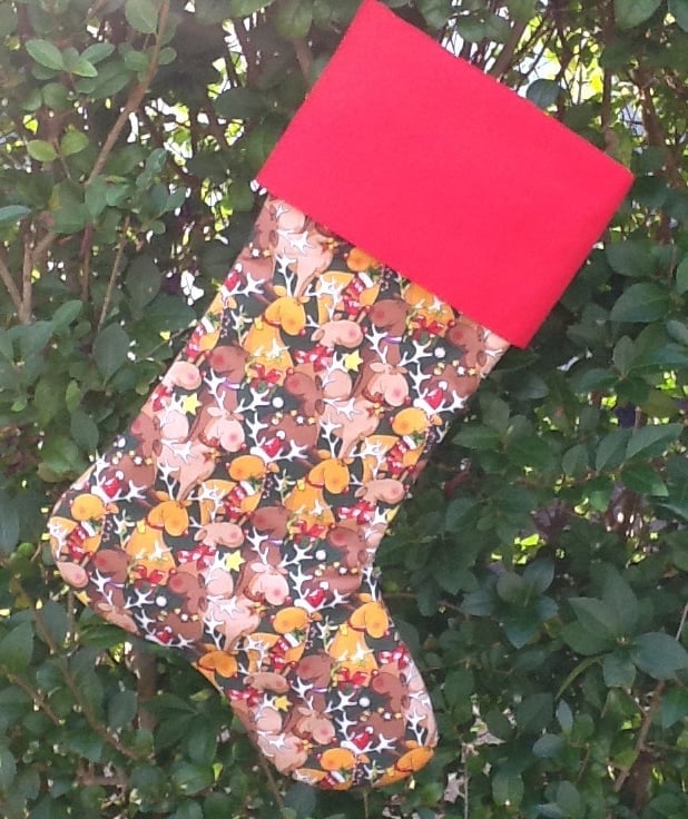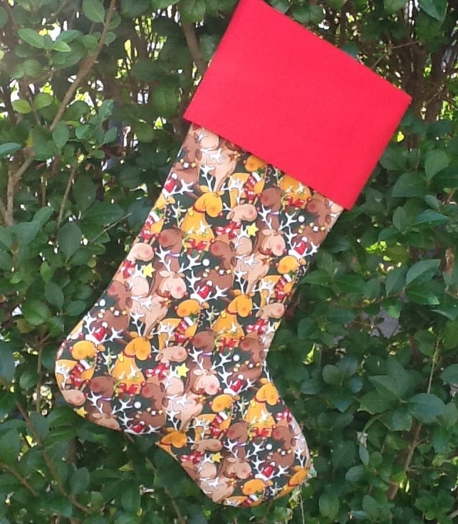 This lovely Santa's Christmas Stocking is Handmade from 2 different coloured Festive fabrics in a Reindeer print fabric in Red's and Green's, and lined with a plain Red Cotton Fabric. It has a small piece of Grosgrain ribbon at the top so its perfect for hanging up on a childs bedroom door ready for Santa to visit the little ones.