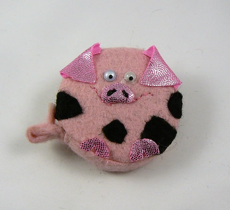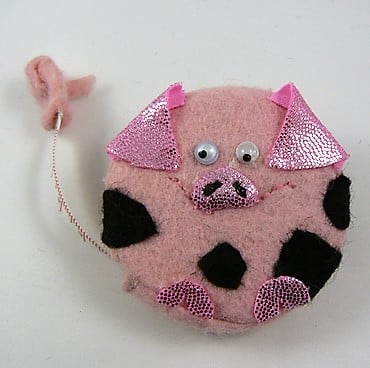 This little piggy tape measure is made of felt and has pink shiny Lycra ears and nose. He has googly eyes and measures 5.5 cm in diameter. The tape is 60" (150 cm ) long and his tail pulls out to measure.