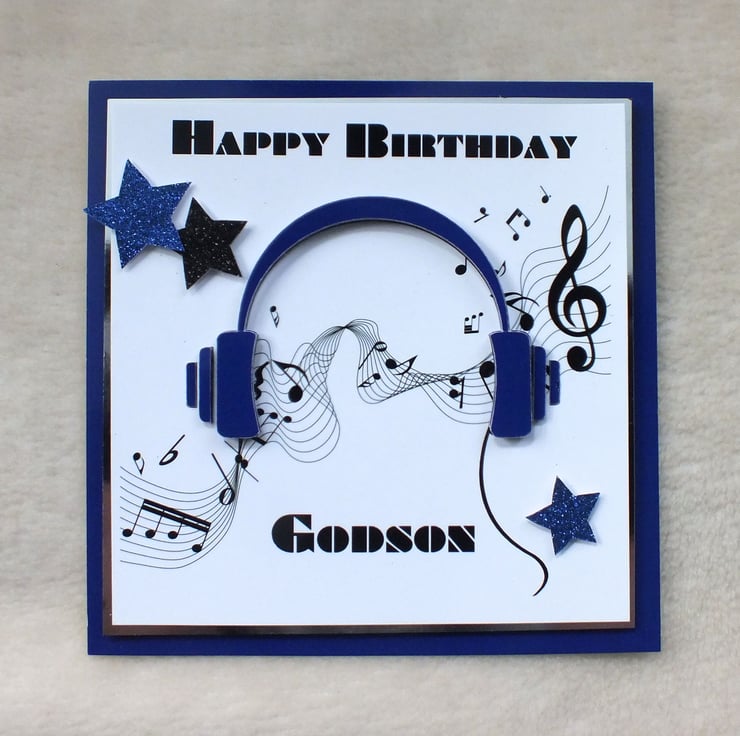 Your Godson will love this stylish headphones birthday card. Measures 7”x7” and is matted and layered with glossy blue and silver mirri card. The head phones have been die-cut and layered up, and embellished with hand cut glitter stars. Includes the sentiment, ‘Happy Birthday Godson’, inside.