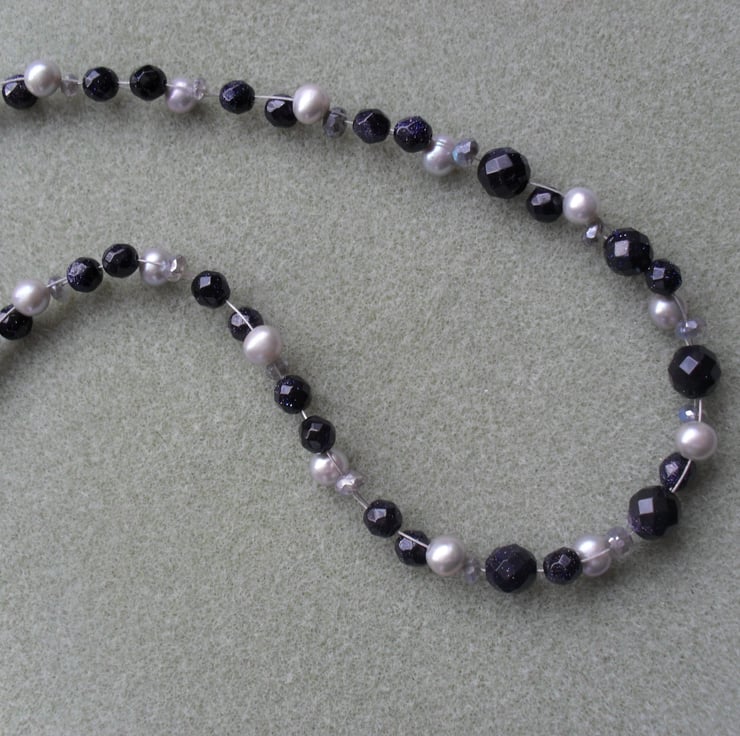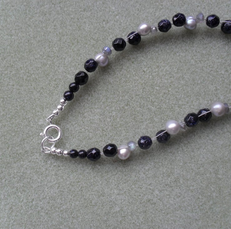 Necklace is made using blue gold stone which is a dark navy blue colour with a glitter like effect in the light. Labradorite and fresh water pearls in a silver colour.