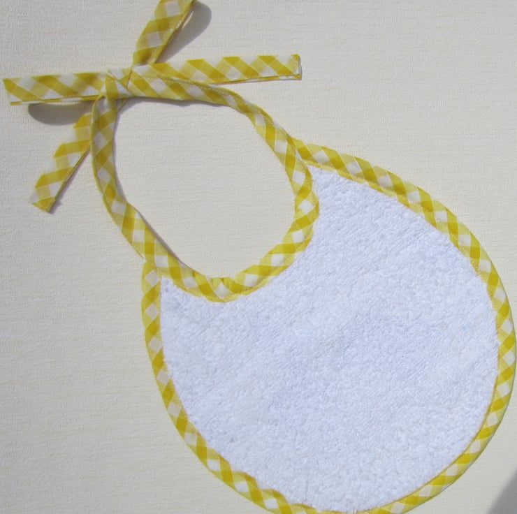 First size babies bib made from unused vintage 1950's fabric. Backed with white towelling and edged in yellow and white gingham check. Suitable for new born babies to about 6 months old.