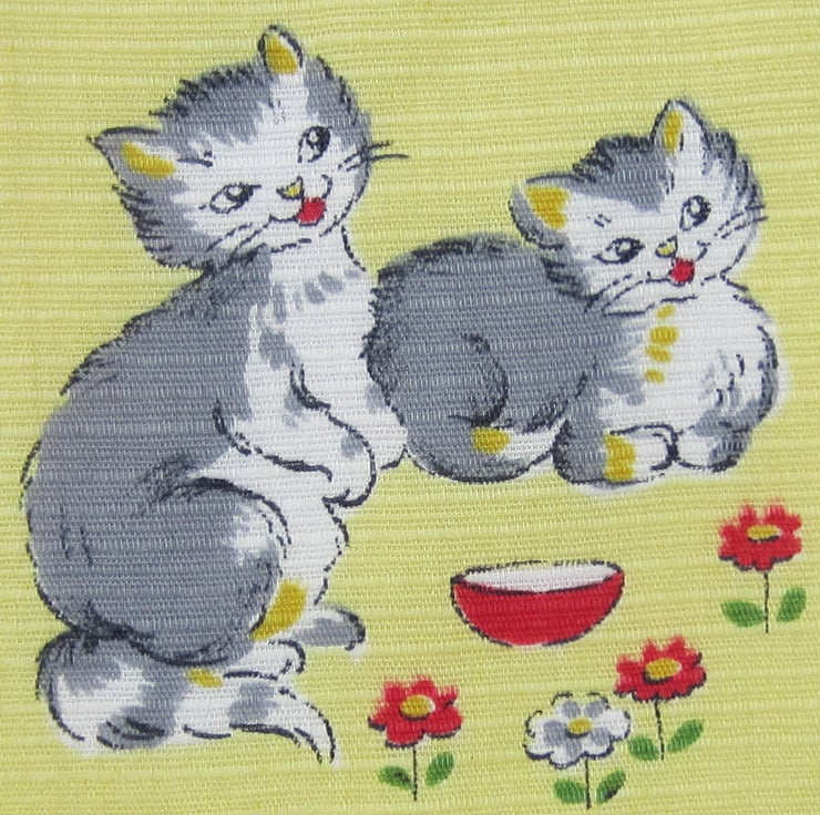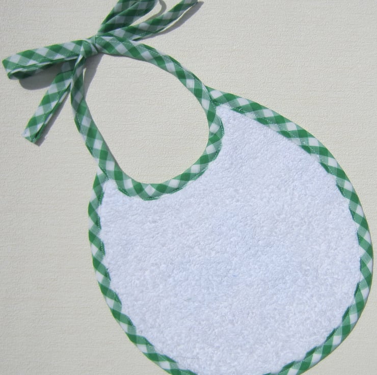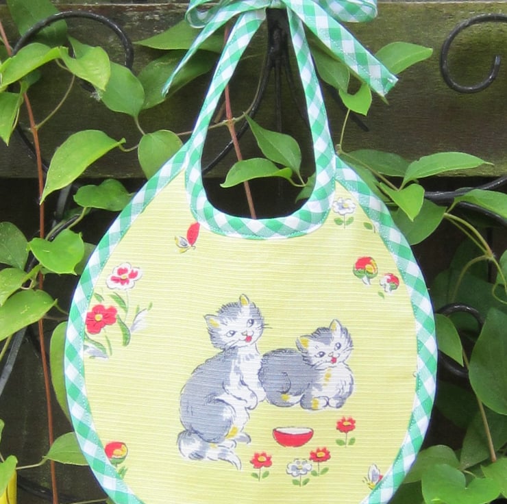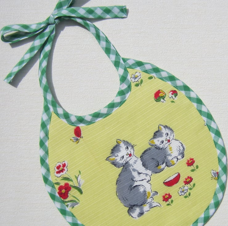 First size babies bib made from unused vintage 1950's kitten fabric. Backed with white towelling and edged in green and white gingham check. Suitable for newborn babies to about 6 months old. Measures 21 cm wide and 22.5 cm long. Fastens with a bow at the back of the neck.