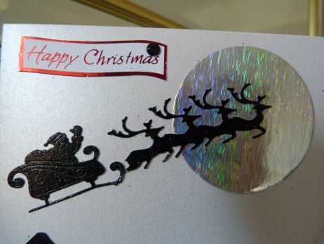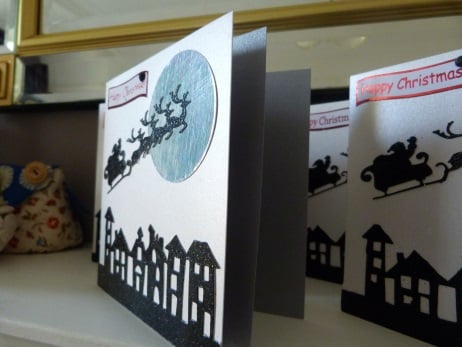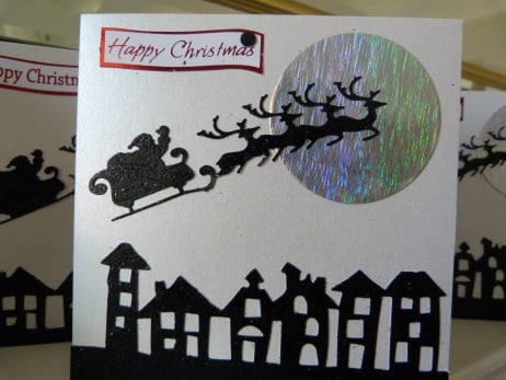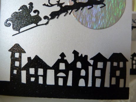 This is a quality pack, completely handmade and uniquely designed. Comprises of a row of houses die cut from black glitter card. A huge silvery moon cut from holographic silver mirri card with Santa and his reindeer die cut from black glitter card flying across after delivering his presents to the houses below. Mounted onto quality silver pearl card. Finished off with Happy Christmas tag with black rhinestone.