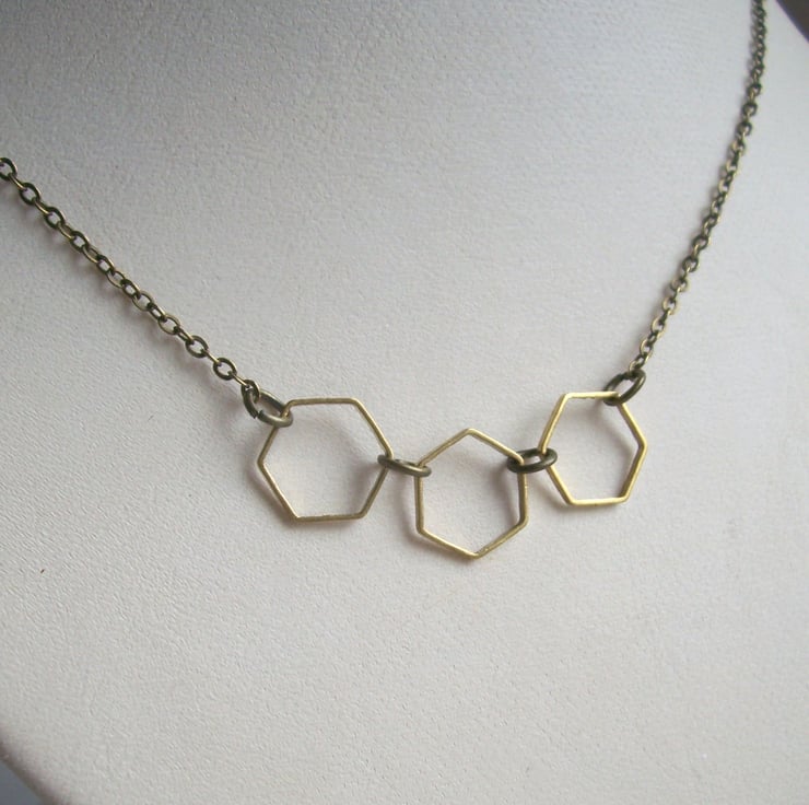Total necklace length is 18": the chain is bronze and the hexagons are golden brass. Nickel free.
