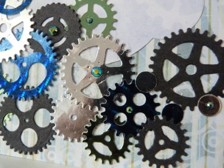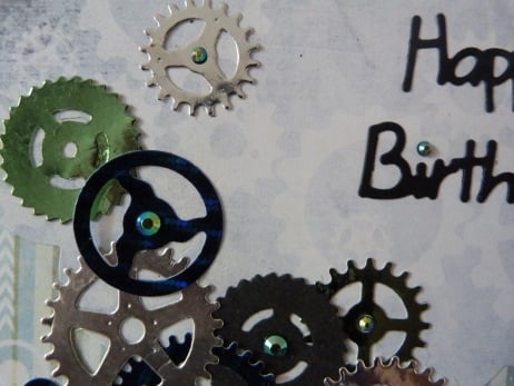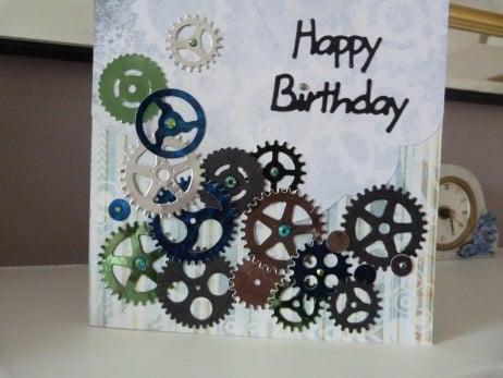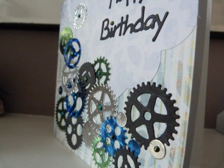 An unusual design perfect for that man in your life who loves tinkering with cars and mechanical things. Consisting of a quality white card which has been covered with two designs of cog related paper. This has been embellished with assorted shaped cogs die cut from silver, green and royal blue mirri card. Also from black card and embellished with blue/green iridescent rhinestones. Finished off with Happy Birthday die cut from black card.