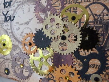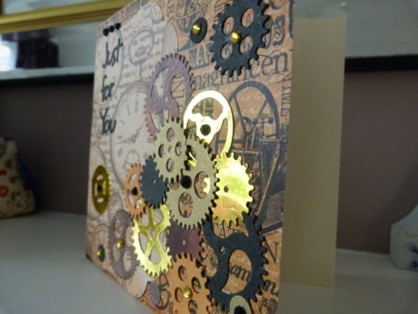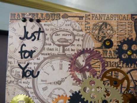 A completely unique handmade design consisting of quality white card which has been covered by co-ordinating papers, one with clock faces and the other steam punk inspired. This has been covered with assorted cogs die cut from gold mirri card, gold card, orange and brown card and black card. Embellished with gold and black rhinestones. Finished off with Just For You die cut from black card.