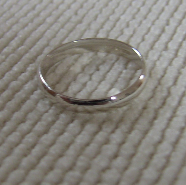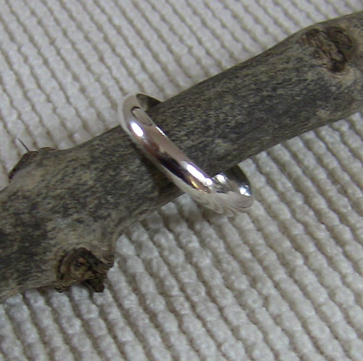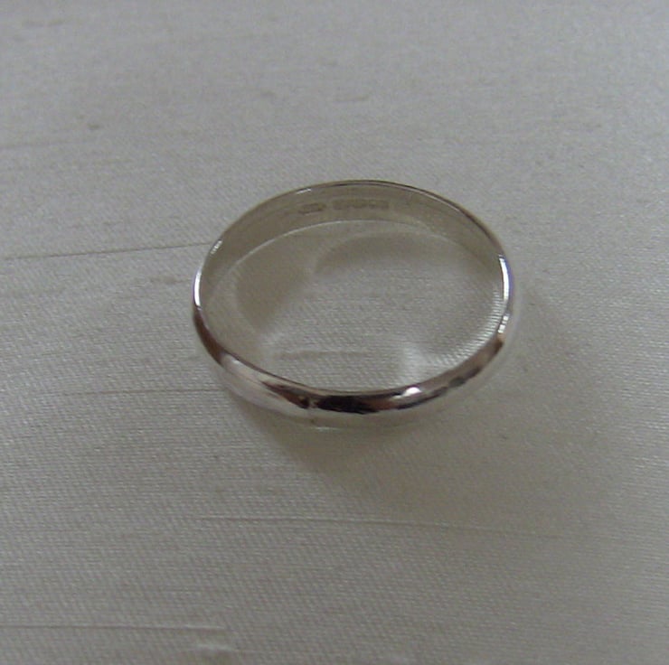 This classic ring is made from 3mm wide D-shaped wire, tumble-polished to a high shine and hallmarked at the London Assay Office. It is currently available in size S/T, so could be suitable for a man or a lady depending on finger size. If you would like a different size then please e-mail me your ring size and I should be able to make it in a couple of days. The ring can be given a matt finish if you prefer.