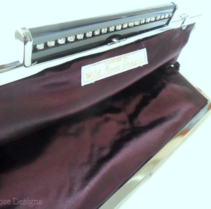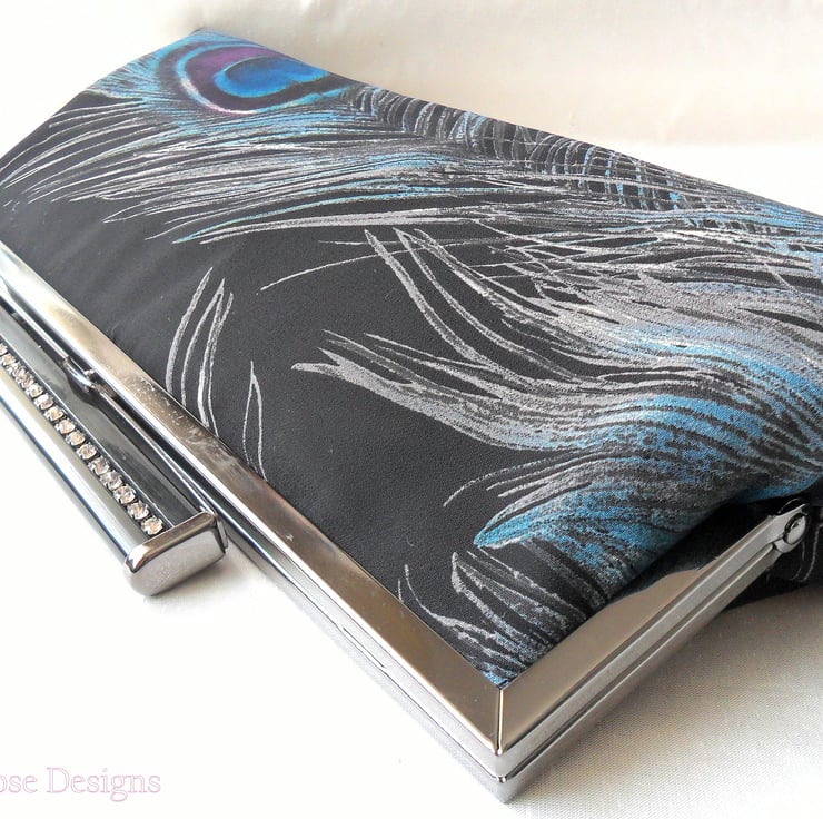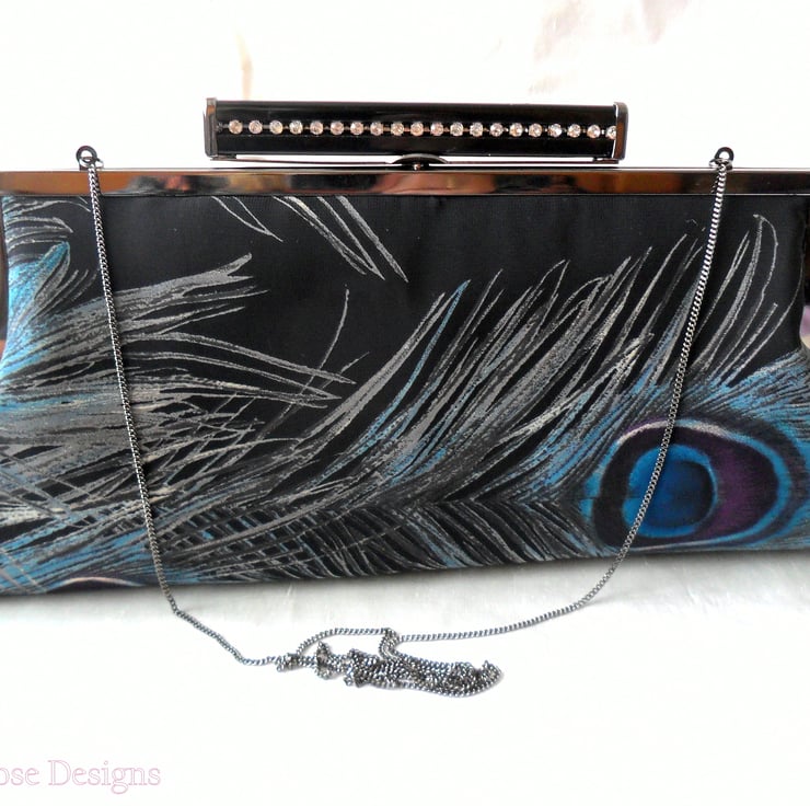 This fabulous Art Deco style evening bag is handmade using black satin with a teal peacock feather print Chiffon overlay and is lined in aubergine satin. The gunmetal bag frame is in an Art Deco style with a diamante studded black spring clasp. It measures 14" x 6" x 1 1/2" (35.5 x 15 x 4 cm) at the widest points and has a 1 metre (39") gunmetal chain handle which tucks neatly inside the bag when not needed.