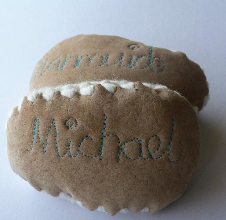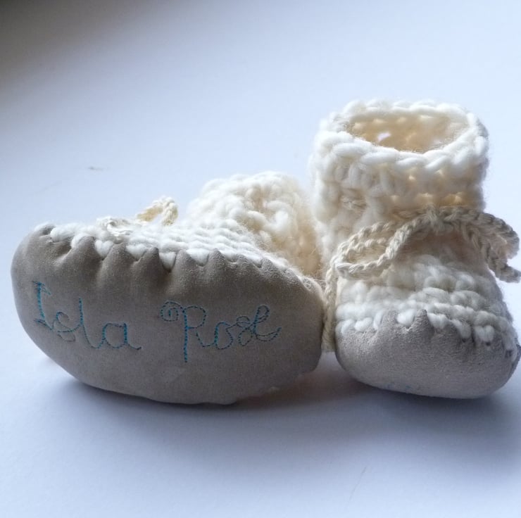 Delighted to have found this lovely soft Norwegian wool in classic off-white. Now customizable with name embroidered on sole.