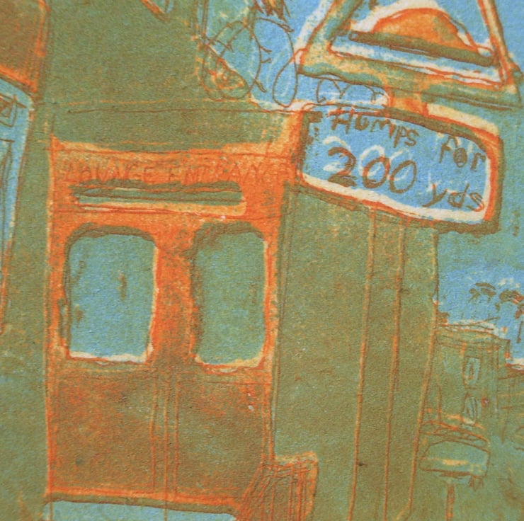 Each Salford print is 2 colours - I ink the plate with one colour and make a print, then re-ink with another colour (often wiping sections away) and print again over the first print.