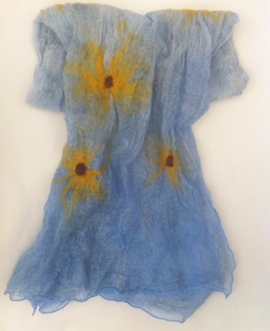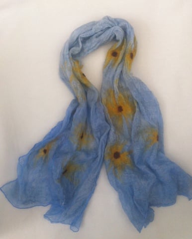 A gorgeous light and airy but still warm scarf made from all natural materials using a blend of blue shades of merino wool and silk/flax fibres on a silk chiffon base with sunflower detail added. The base scarf has a colour gradient from one end to the other, of blue to white and back to blue. Five large sunflowers have been added to each end of the scarf. The scarf was made using a nuno felting technique which allows the wool fibres to migrate and felt through the silk. Shrinkage of the wool fibres gives a lovely "crinkled" effect to the scarf.