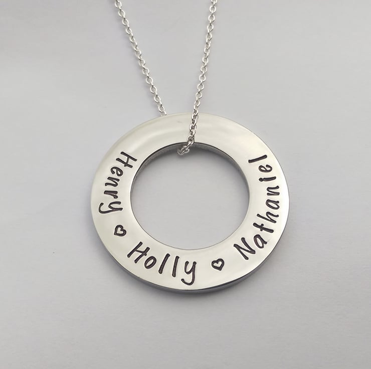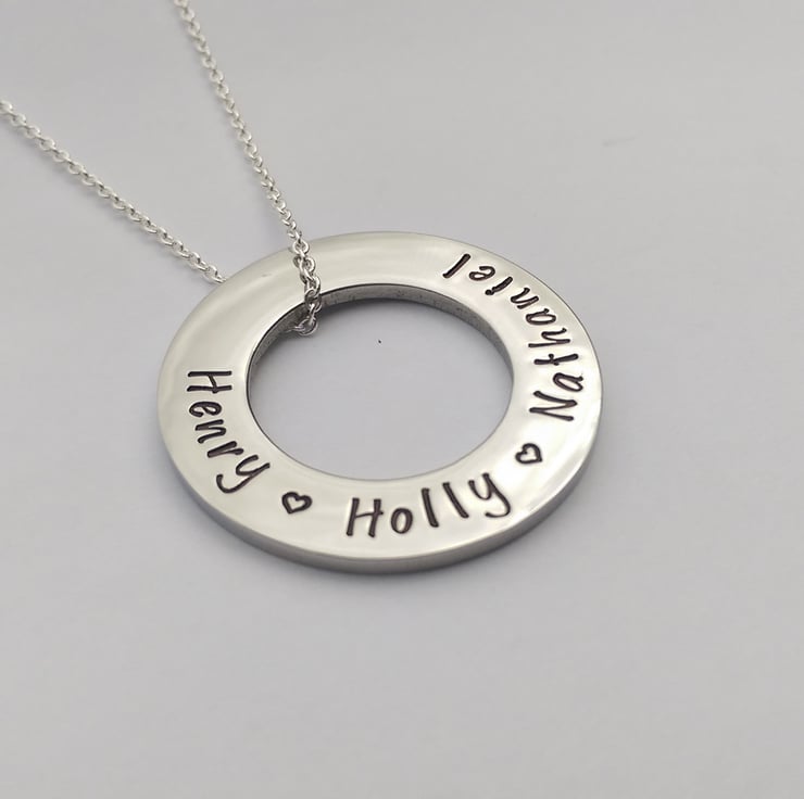 In the notes to seller during checkout please include the names you would like stamped onto the circle.